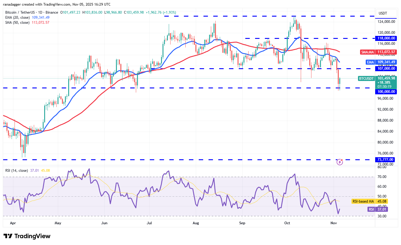 خریداران به شدت از سطح 100000 دلار دفاع میکنند، اما انتظار میرود که بهبود با فروش در سطح شکست 107000 دلار و سپس در میانگین متحرک نمایی 20 روزه (109341 دلار) روبرو شود. اگر قیمت به شدت از مقاومت سربار کاهش یابد، خطر شکست به زیر 100000 دلار افزایش می یابد. اگر این اتفاق بیفتد، جفت BTC/USDT می تواند تا 87800 دلار سقوط کند.