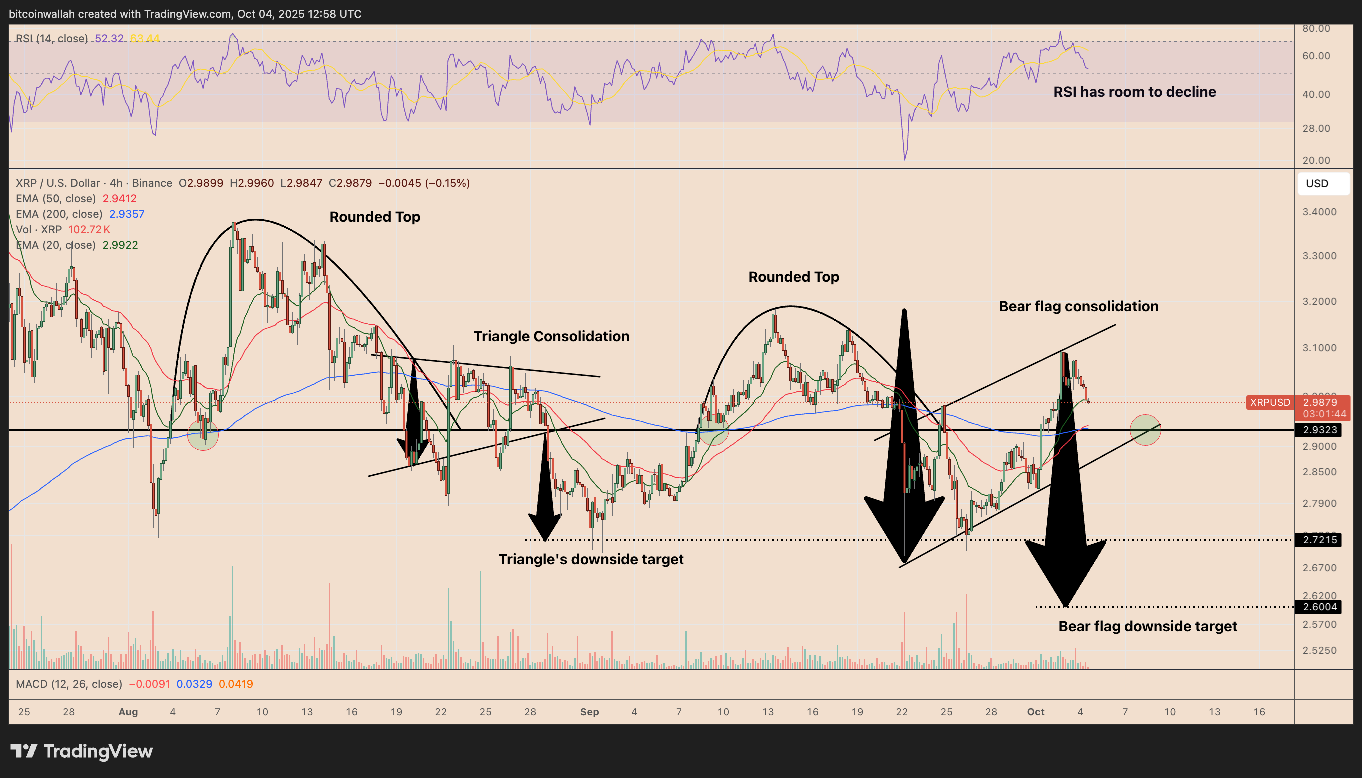 XRP ممکن است ابتدا پشتیبانی پرچم را با 2.93 دلار آزمایش کند. یک نزدیکترین قاطع در زیر آن می تواند یک شکست را تأیید کند ، که به طور بالقوه راه را به 2.60 دلار باز می کند ، که تقریباً 15 ٪ از قیمت های فعلی کاهش می یابد.