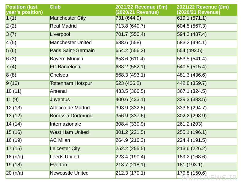 دیلویت 20 باشگاه فوتبال پردرآمد برای فصل 2021/22 را معرفی کرد که لیورپول برای اولین بار بالاتر از رقبای سرسخت منچستریونایتد قرار دارد.