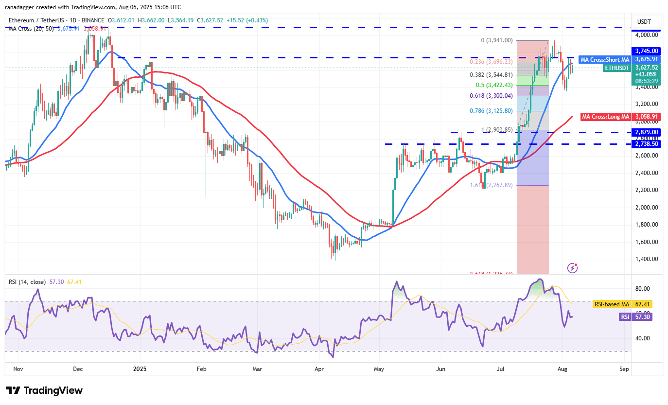 خریداران روز دوشنبه اتر (ETH) را بالاتر از SMA 20 روزه (3،675 دلار) تحت فشار قرار دادند اما نتوانستند این مانع را با 3،745 دلار پاک کنند.