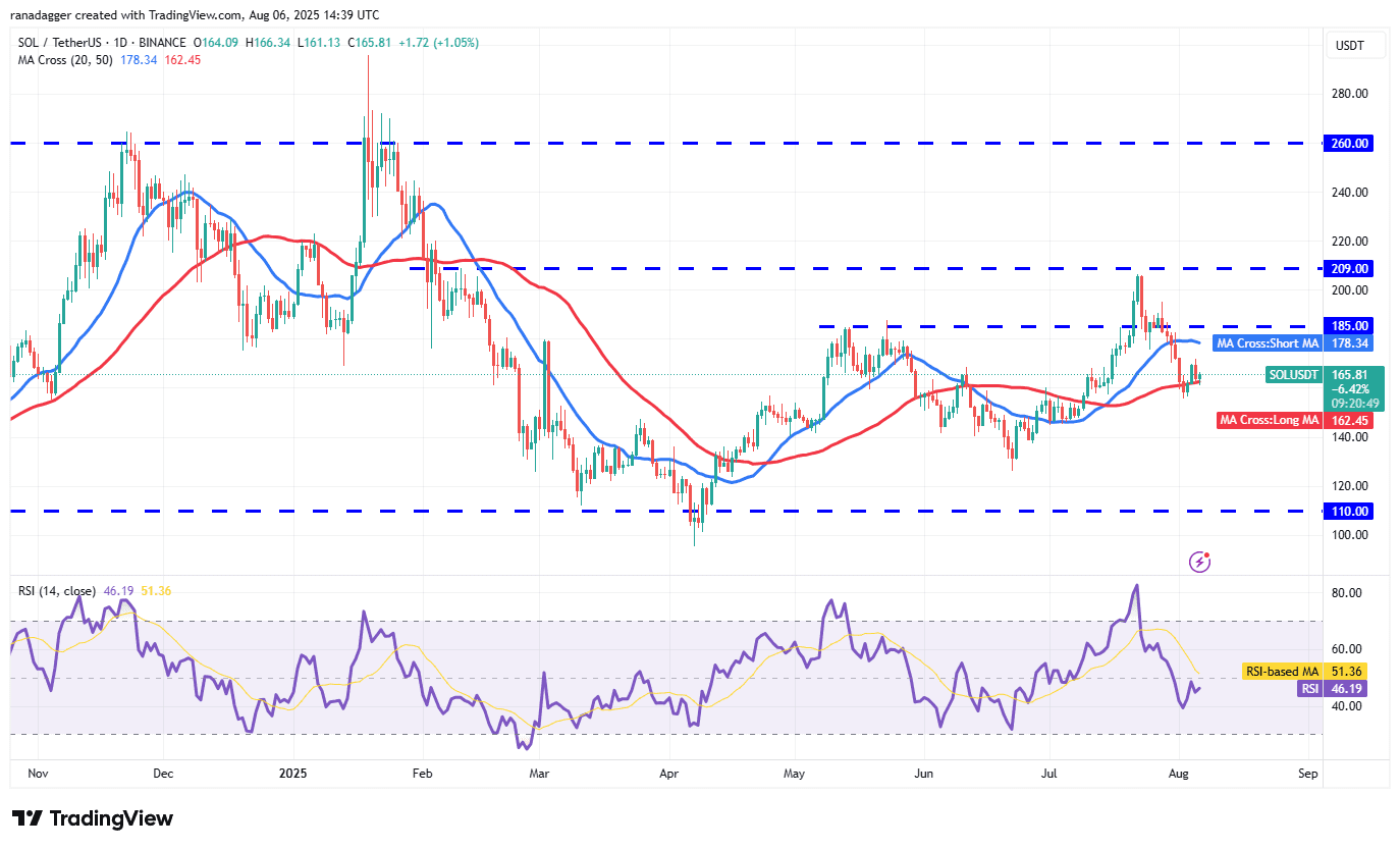 میانگین حرکت مسطح و RSI درست در زیر نقطه میانی مزیت روشنی را به گاوها یا خرس ها نمی دهد. اگر قیمت از SMA 50 روزه با قدرت برگردد ، جفت SOL/USDT می تواند به SMA 20 روزه (178 دلار) افزایش یابد.