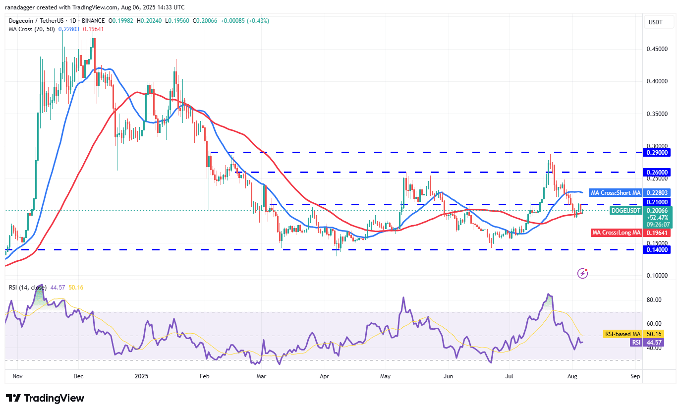 خریداران موفق شده اند از SMA 50 روزه (0.19 دلار) دفاع کنند اما در تلاشند تا Dogecoin (DOGE) را بالاتر از مقاومت 0.21 دلار تحت فشار قرار دهند.