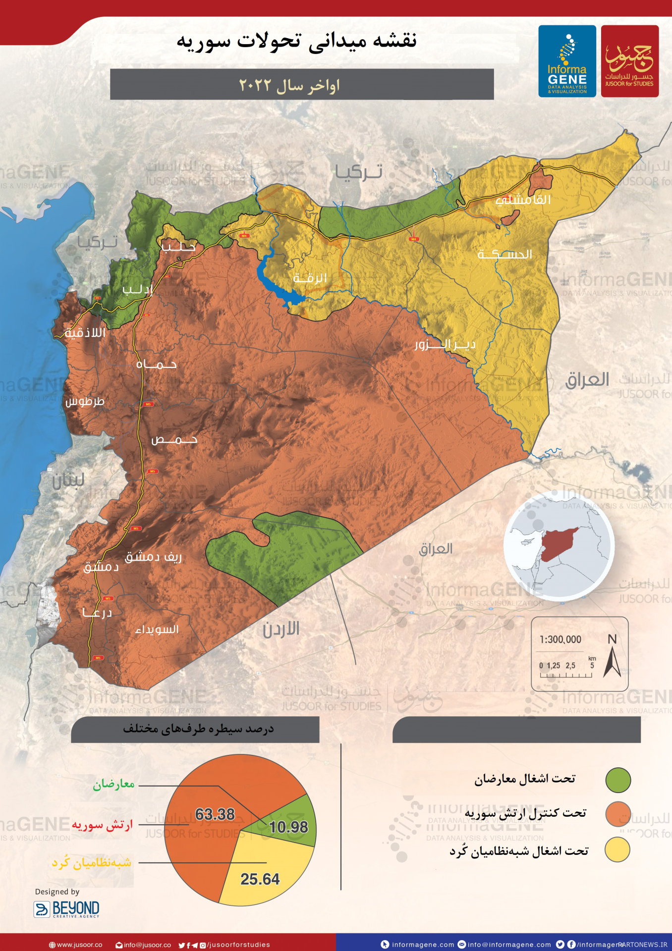 يشار إلى أن الجزء الشمالي من سوريا غربي نهر الفرات من شمال اللاذقية إلى منطقة جرابلس شمال شرقي حلب يعتبر خاضعًا لتأثير تركيا. وإلى الشرق من الفرات ، تخضع منطقتا “تل أبيض” شمال الرقة و “رأس العين” شمال الحسكة لسيطرة تركيا.