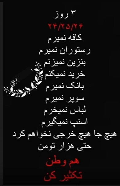 *“بعد خيبة أمله بسبب انعدام الأمن وحرب المدن ، وضع العدو الآن الحرب النفسية والاقتصادية على جدول أعماله ، وفي الإجراء الأخير ، أعلن 24 و 25 و 26 نوفمبر أيامًا غير شراء وغير بيعية من أجل ضرب اقتصاد تجار التجزئة. ، كلاهما يوفر أسبابًا لعدم الرضا ويهاجم دورة الإنتاج والتوزيع في البلاد. من أجل كسر هذه الموجة ، نوصي أصدقائنا وعائلتنا بزيارة السوق هذا الأسبوع وحتى لو تم الإعلان عن ذلك ، لإجراء عمليات شراء الأسبوع المقبل هذا الأسبوع. بمعنى آخر ، اجعل هذه الأيام الثلاثة أكثر أيام السوق ازدحامًا. هذا العمل لا يقل عن ذهابنا إلى مسيرة 13 آبان وسيوجه ضربة أخرى للعدو السعودي الصهيوني ويخرج السوق من هذا الركود “.