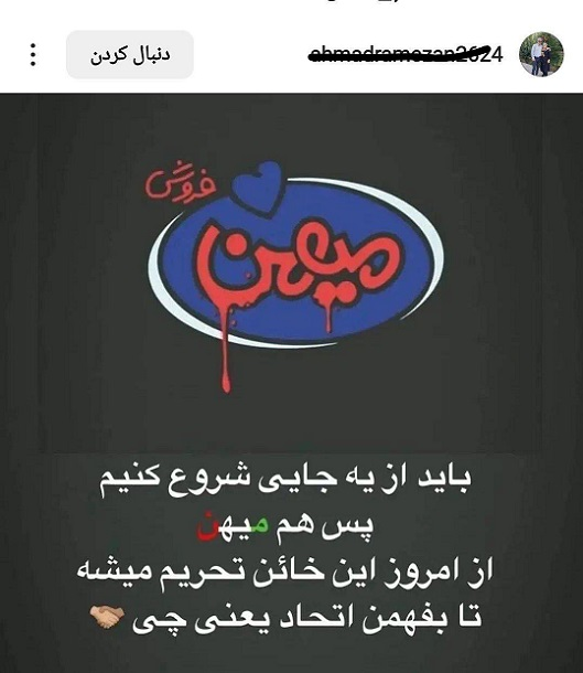على الجانب الآخر من العملة ، العالم له لون مختلف. إذا ذهبت إلى القنوات والجماعات الثورية والدينية والوطنية ، فستظل ترى هذه المجموعة تعمل من أجل البلد. الكل حريص على دعم السوق الوطنية والباعة الكرام. منذ عدة أيام ، شعروا بالحزن من خلال تشجيع بعضهم البعض على إجراء عمليات شراء قلقة في هذه الأيام الثلاثة ، حيث اختار العدو وأتباعهم الداخليون الغافلون مقاطعة البيع والشراء. يبدو الأمر كما لو أن الجميع قد تقدموا برأفة وطنية بأي طريقة ممكنة ويحاولون إحباط هذه المؤامرة الجبانة. الرسائل التالية مثال على هذا القلق في جماعة أمومية في أحد الرسل الإيرانيين: