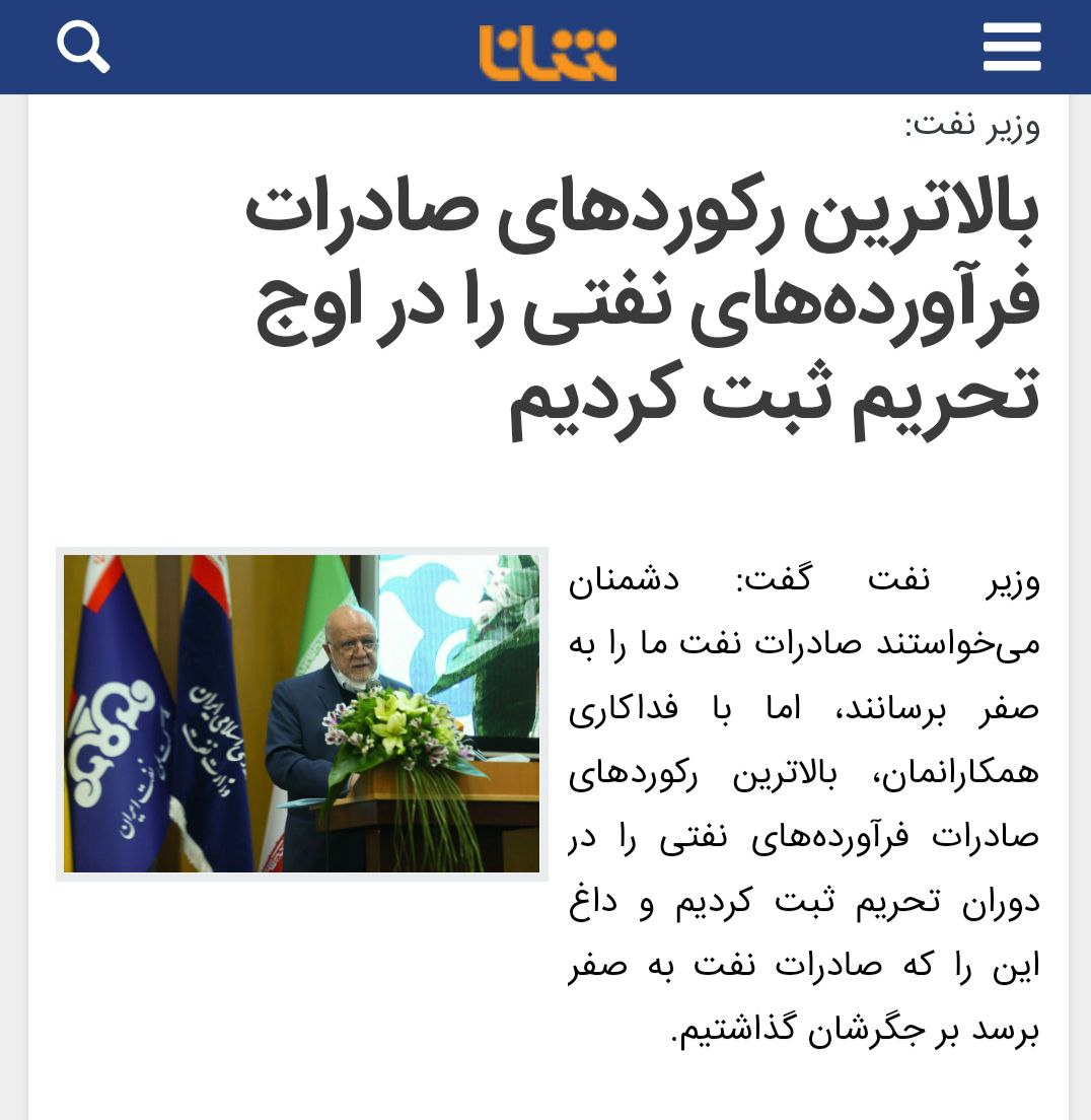 على حد تعبير وزير النفط السابق ، يمكن للمرء أن يقيس بدقة قدرة البلاد على المناورة في تصدير النفط والمنتجات في ظروف العقوبات ، حيث على الرغم من الصادرات القياسية للمنتجات النفطية ، إلا أن عدم الوصول إلى الصفر في صادرات النفط يعتبر إنجازًا.