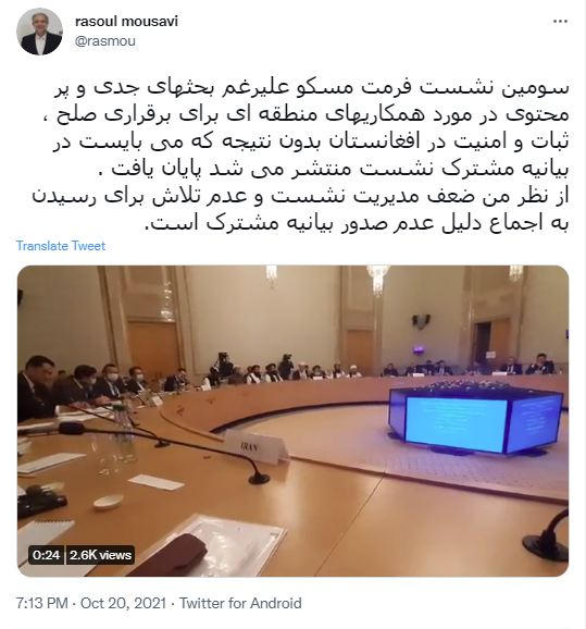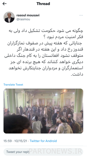 في هذا الصدد كذلك سيد رسول موسوي وكتب مساعد وزير الخارجية في تغريدة عقب الفظائع الأخيرة في قندز وقندهار: “إن الفظائع التي وقعت الأسبوع الماضي في صفوف المصلين في قندوز وهذا الأسبوع في قندهار ، إذا لم تتوقف ، ستقود أفغانستان إلى حرب أهلية أخرى مع لا فائز إلا المستعمرون والمرتزقة “. لن يكون للمجرم ذلك.
