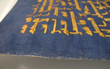 كُتبت الصفحات بالحبر الذهبي على غلاف ملون باللون النيلي ، مما يضفي عليها لونًا أزرق مميزًا. ربما تأثرت كتابة القرآن بالذهب على غلاف أزرق بوثائق رسمية دقيقة كتبها الإمبراطورية البيزنطية المسيحية.