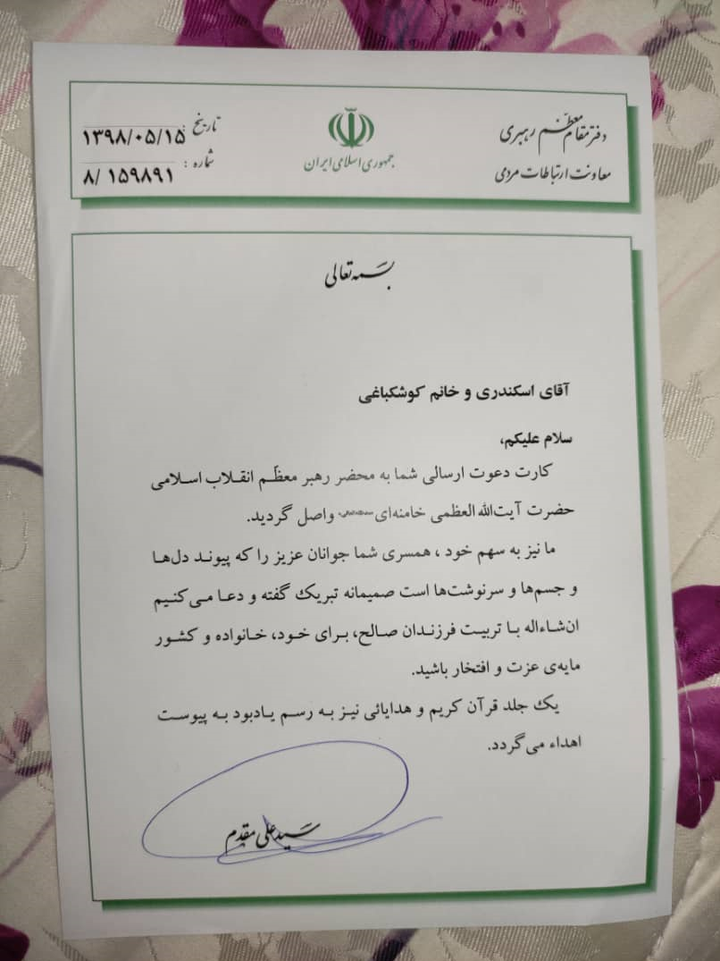 القصة الغريبة لبطاقة زفاف حميد وفايزة التي وصلت إلى المرشد الأعلى للثورة / اشترينا خدمة فضية بدلاً من الذهب