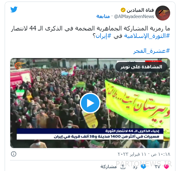 موقع عراقي شفق نيوز وكتب أن الإيرانيين شاركوا على نطاق واسع في ساحة آزادي بطهران وشوارع المدن الأخرى في ذكرى انتصار الثورة الإسلامية.