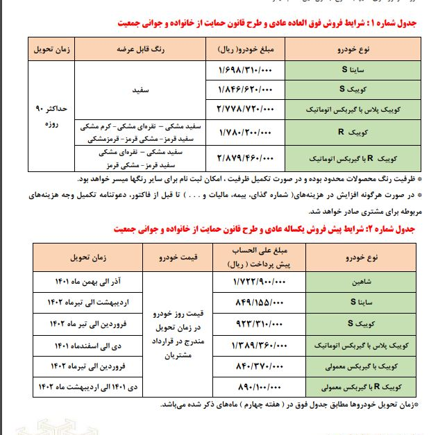 توفر منتجات Saipa جداول وشروط البيع أعلاهرائع مشروع قانون عادي لدعم الأسرة وشباب السكان
