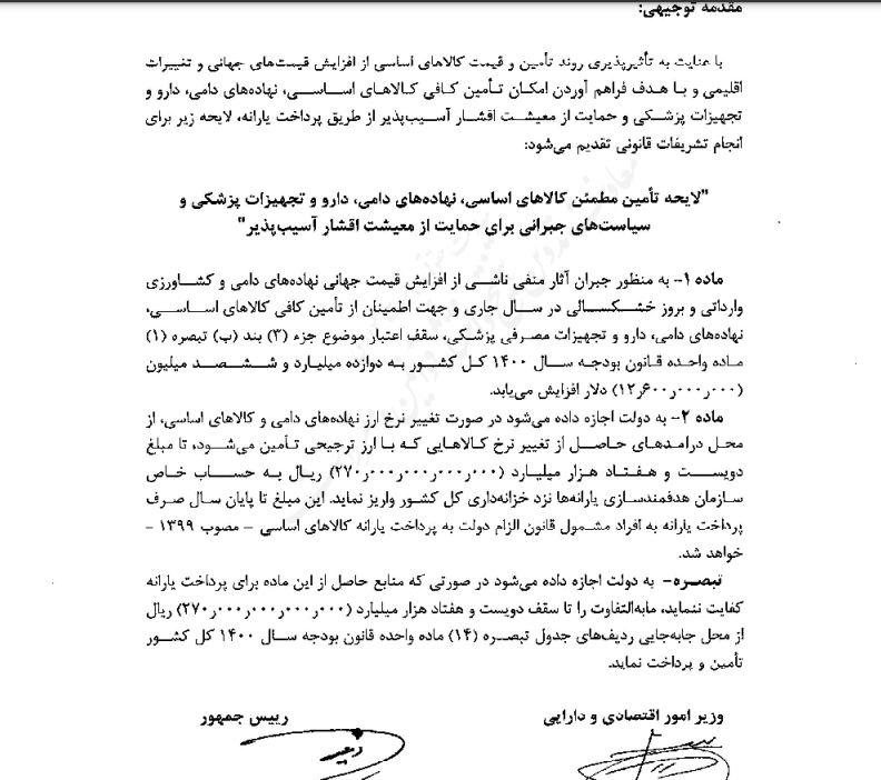 وفقًا للمراسل الاقتصادي لوكالة أنباء فارس ، سيد إبراهيم رئيسي ، رئيس الجمهورية ، اليوم 10 نوفمبر 1400 ، في رسالة إلى قاليباف ، رئيس مجلس الشورى الإسلامي ، اقترح مشروع قانون لتوفير السلع الأساسية ومدخلات الثروة الحيوانية والأدوية والطبية. المعدات والسياسات التعويضية لسبل عيش الفئات الضعيفة. في اجتماع 26 نوفمبر 1400 لمجلس الوزراء ، وافقت هيئة التخطيط والميزانية الحكومية على الشرطين المعتمدين بشكل عاجل للإجراءات القانونية. Tomans من السلع الأساسية وخطة التعويض عن رزق الطبقات قدم مشروع قانون 27 الف مليار تومان الى البرلمان.