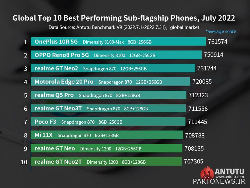 نشرت Antutu أيضًا قائمة أقوى الهواتف المتطورة ، حيث تتساوى حصة رقائق Qualcomm و MediaTek تقريبًا. في هذه القائمة ون بلس 10R مع الرقاقة البعد 8100 كحد أقصى والنتيجة التي تزيد عن 760 ألفًا تم وضعها في القمة.