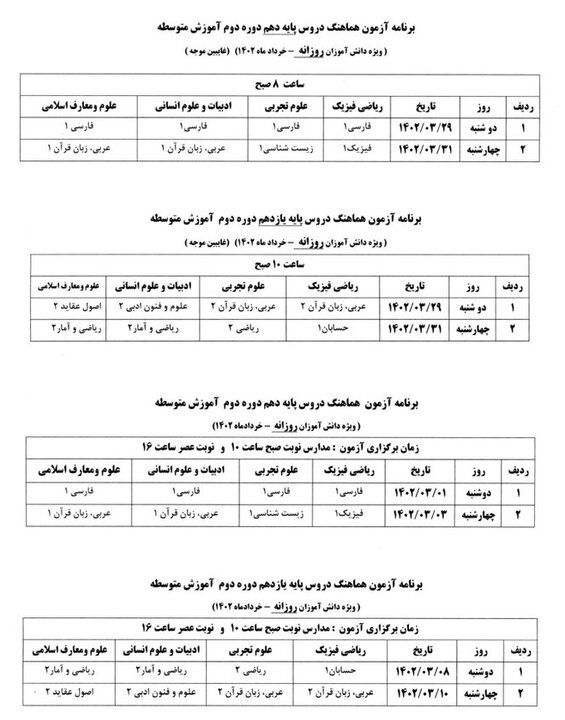 وبحسب المنشور ، فإن جدول الامتحانات النهائية للصف الثاني عشر يوميا للكبار ، والتعليم عن بعد والمتطوعين مجانا من الفروع النظرية ، الفترة الثانية من التعليم الثانوي ، للمتقدمين لإنشاء سجل أكاديمي وإصلاح الدرجات والجدول الزمني. الامتحان المنسق للصفين العاشر والحادي عشر للمدارس النهارية في شهر يونيو ويبدأ العام 1401-1402 من 31 مايو ويستمر حتى 25 يونيو.