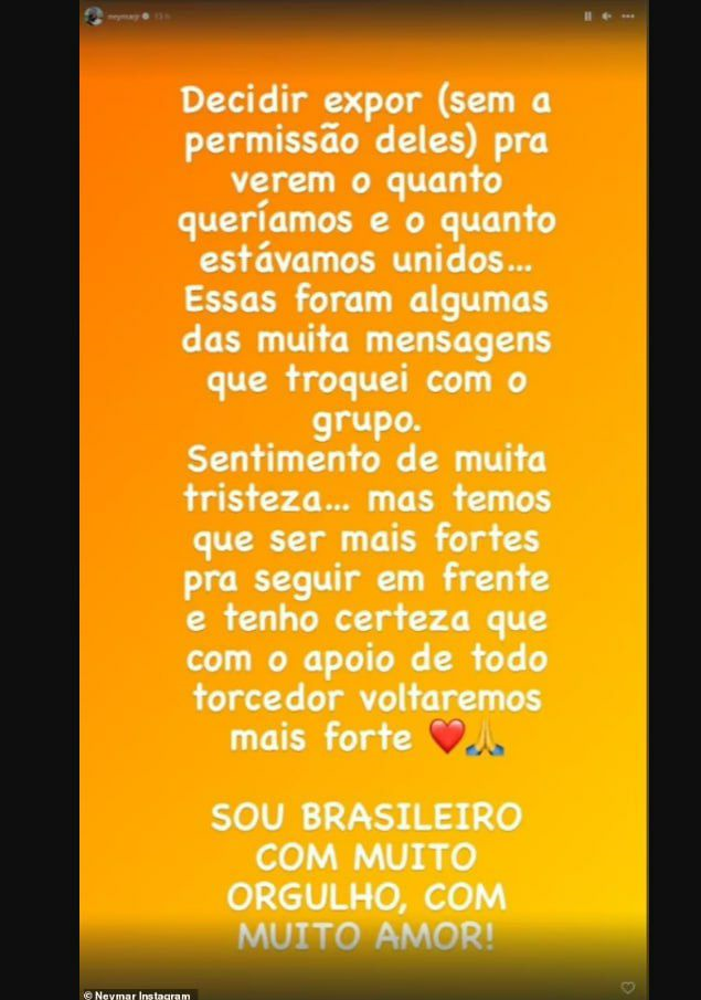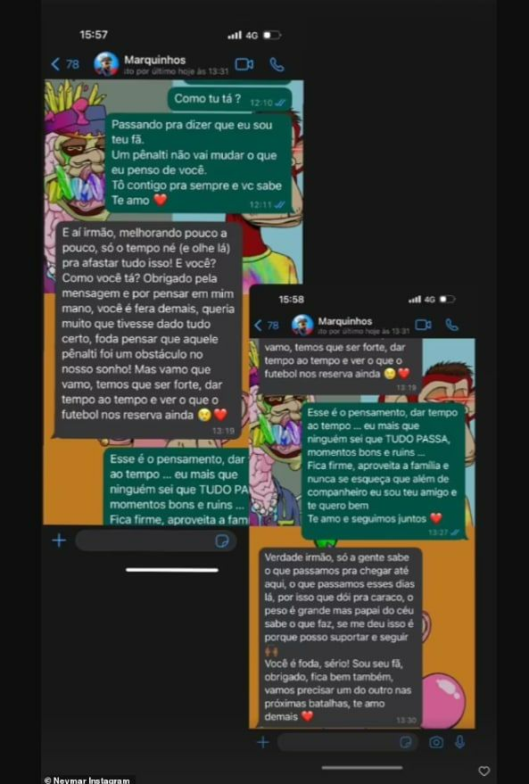 نشر نيمار محادثاته مع ماركينيوس ورودريجو الذي أهدر ركلة جزاء في المباراة مع كرواتيا ، وعزاهم بإرسال رسائل على صفحته بغض النظر عن خصوصية اللاعبين البرازيليين.