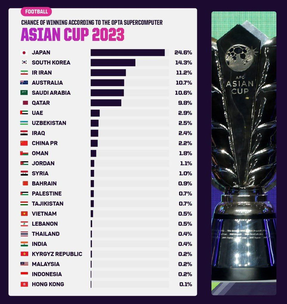 حددت بعض المواقع التحليلية الأجنبية فرص الفوز ببطولة كأس أمم آسيا 2023 من وجهة نظرها، بأن اليابان وكوريا الجنوبية وإيران صاحبة الفرص الأولى إلى الثالثة للبطولة على التوالي. وتقع أستراليا والمملكة العربية السعودية في المرتبتين الرابعة والخامسة في هذا الجدول. هونج كونج، أحد الفرق الزميلة لإيران، يقع في المركز الأخير في هذا الجدول وقد يصبح البطل أقل من واحد بالمائة! فقط 0.1% من هذا الفريق لديه الفرصة للفوز بالبطولة.