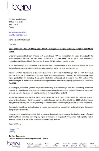 ورد في جزء من هذه الرسالة ، التي تم إرسالها إلى الشبكات الدولية وشبكات بيرسيانا بشكل منفصل ، ما يلي: “بناءً على الاتفاقية المبرمة بين FIFA و beIN Media Group ، منح FIFA مجموعة beIN الإعلامية الحق الحصري لبث كأس العالم FIFA 2022 في قطر. – كأس العالم لكرة القدم 2022 – (مباشر ، مؤجل ومتكرر) في منطقة الشرق الأوسط وشمال أفريقيا (MENA) ، بما في ذلك إيران. وبناءً على ذلك ، فإن أي بث لمباريات كأس العالم 2022 للإيرانيين في إيران يعد انتهاكًا لهذه الحقوق الحصرية وسيؤدي إلى أضرار جسيمة لقناة beIN. يتم التعامل مع هذا على أنه إشعار قانوني لضمان امتثالك الفوري ومنع أي إجراء آخر في هذا الشأن. لا يوجد في هذه الرسالة ما يمثل تنازلاً صريحًا أو ضمنيًا عن حقوق أو تعويضات beIN ؛ بما في ذلك أي حقوق أو تعويضات فيما يتعلق بالانتهاك غير المنصوص عليها صراحة ، سواء الآن أو في المستقبل ، وكلها منصوص عليها صراحةً “.
