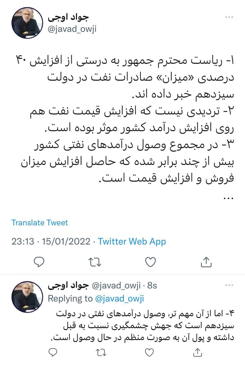 لكن ردا على تصريحات الرئيس ، وصف عبد الناصر حمتي ، رئيس البنك المركزي الإيراني السابق ، دور الحكومة الـ13 في تحييد العقوبات بأنه غير فعال وقال: “نبأ زيادة بنسبة 40٪ في قيمة النفط الإيراني. الصادرات أخبار واعدة اقتصاد البلاد فعال ، لكن النقطة المهمة هي أن السعر العالمي للنفط والمنتجات البترولية في عام 2021 مقارنة بعام 2020 ارتفع بنسبة تزيد عن 60 في المائة. والسؤال الآن ما هو نصيب جهود الحكومة الثالثة عشرة لتحييد العقوبات (وزيادة عائدات النفط بنسبة 40٪)؟
