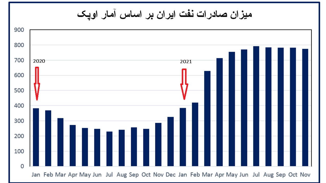 يوضح الشكل 3 أيضًا حجم صادرات النفط الإيرانية وفقًا لإحصاءات أوبك. وبحسب هذه الإحصائيات ، فقد زادت صادرات النفط الإيرانية من حوالي 350 ألف برميل يوميًا إلى 800 ألف برميل يوميًا.