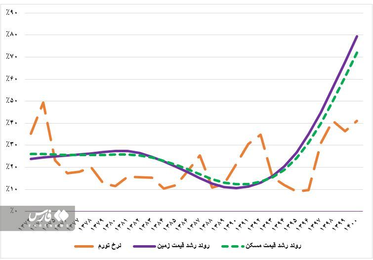حسب الرسم البياني لحصة تكلفة قطاع الإسكان في سلة استهلاك الأسر الحضرية في إيران مقارنة بالمؤشر العالمي خلال الفترة من 1373 إلى 1400 ، في معظم السنوات اتجاه نمو أسعار الأراضي واتجاه نمو أسعار المساكن أعلى من معدل التضخم.