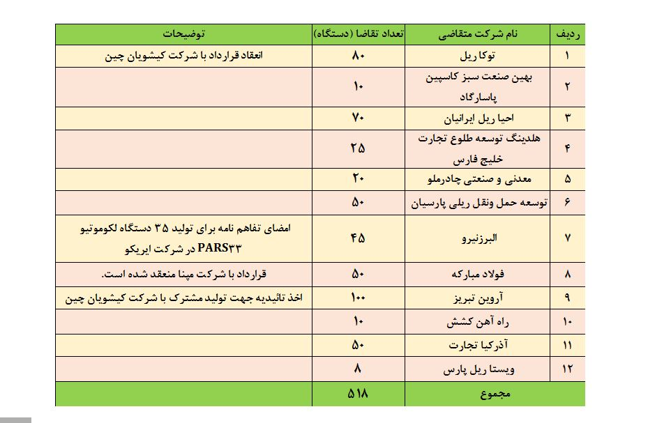 قال الرئيس التنفيذي لشركة السكك الحديدية أيضًا أن لدينا 15000 كيلومتر من السكك الحديدية التي تتطلب المزيد من القاطرات ، وقد تم تأريض أقل من 200 قاطرة في السنوات الثلاث الماضية (حتى 1400) ، منها 60 إلى 70 تم تأريضها هذا العام وحده ( 1400). يبلغ متوسط عمر قاطرات الركاب اليوم أقل من 10 سنوات وقاطرات الشحن أكثر من 30 عامًا ، والتي إذا لم يتم إعادة بنائها ، فسيحدث ضرر مزدوج.