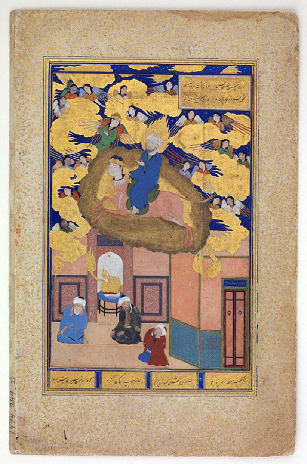 بعد التيموريين ، حكم الصفويون إيران لأكثر من قرنين ، تاركين آلاف الأمثلة على تقنيات الرسم. أدى الإيمان القوي بأسرة النبي وأحكامهم المسبقة القوية إلى تطورات جديدة في أيقونية رسول الله صلى الله عليه وسلم ، لا سيما في مشهد الصعود. أدت المعتقدات الدينية للصفويين خلال الطائفية الشيعية إلى جزء كبير من أيقونات الطقوس ذات الذوق الأكثر شعبية في برلمانية الصعود وبين أعمال الفن الشيعي. يبدو أن القناع الذي غطى به وجه رسول الله صلى الله عليه وسلم كان مندمجا في العصر الصفوي وأثناء التحيزات الشديدة لمعتقداتهم الدينية ، لأنه عند تصوير بعض النسخ الأخرى المصورة ، ظهر وجه رسول الله بوضوح. . العصر الصفوي هو نهاية التاريخ الأوسط لإيران.