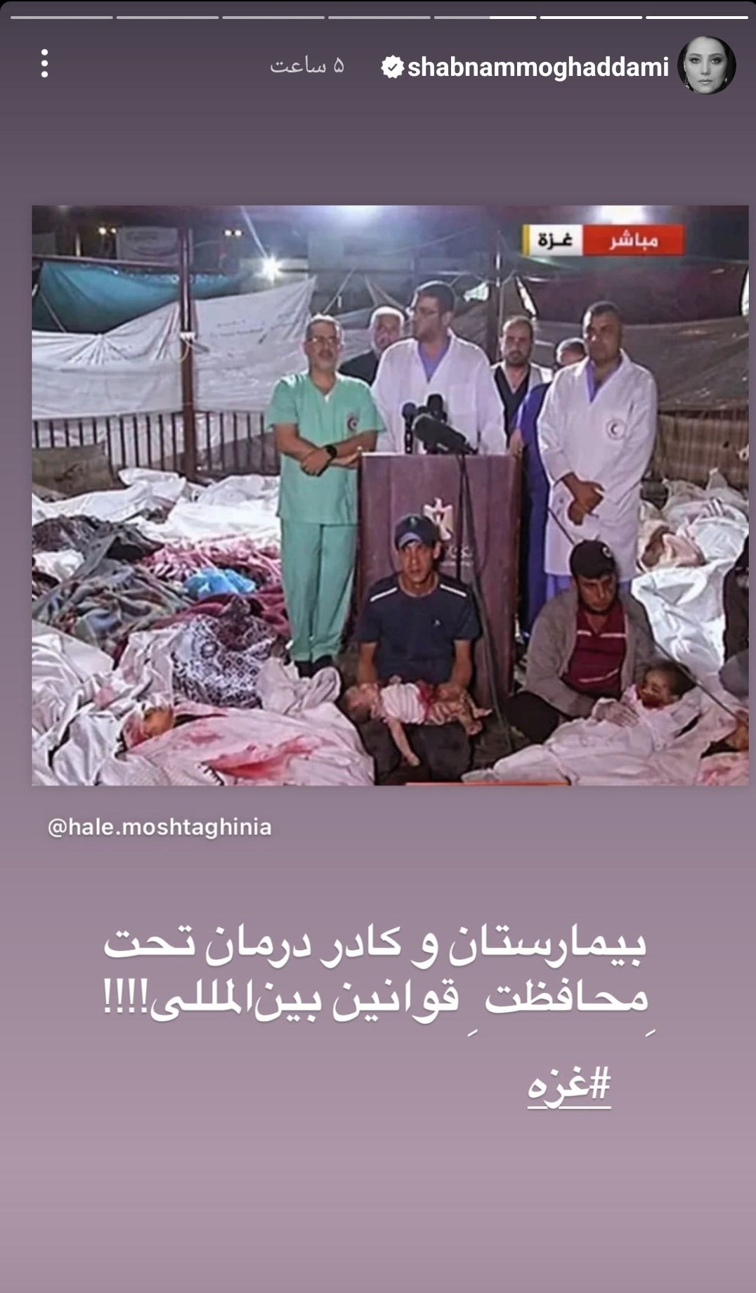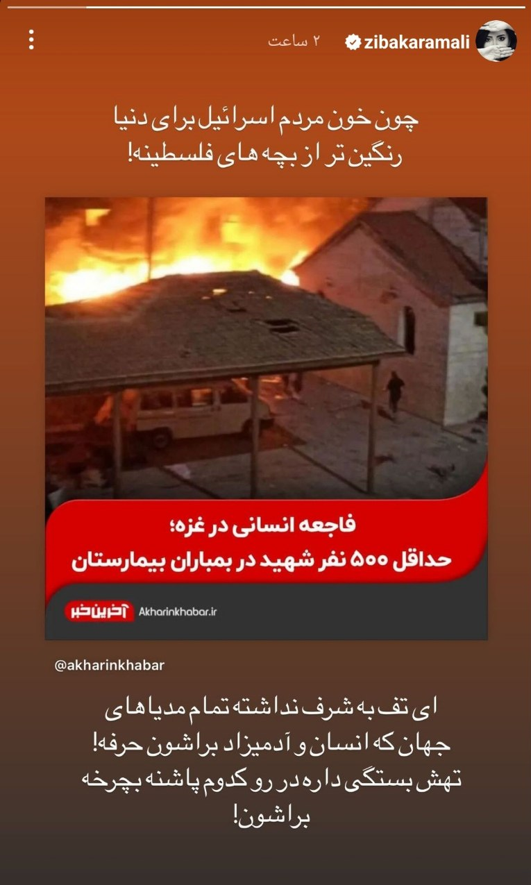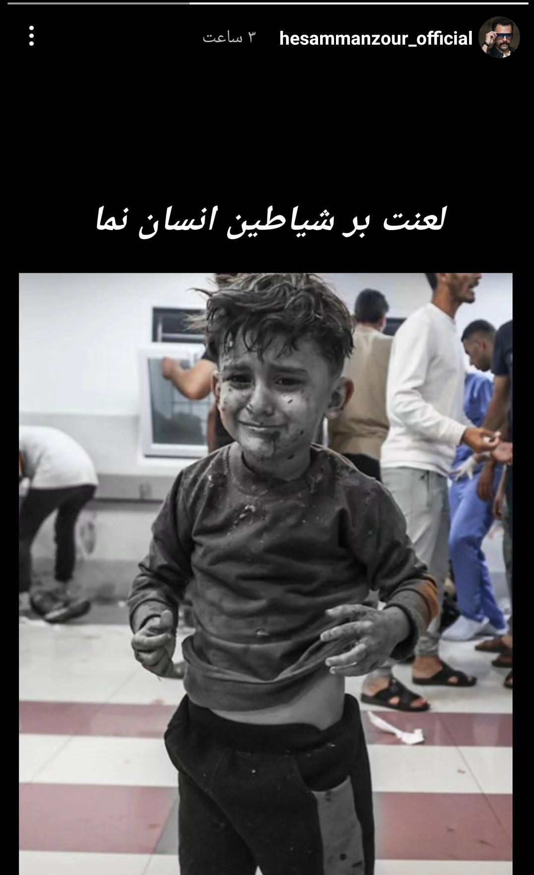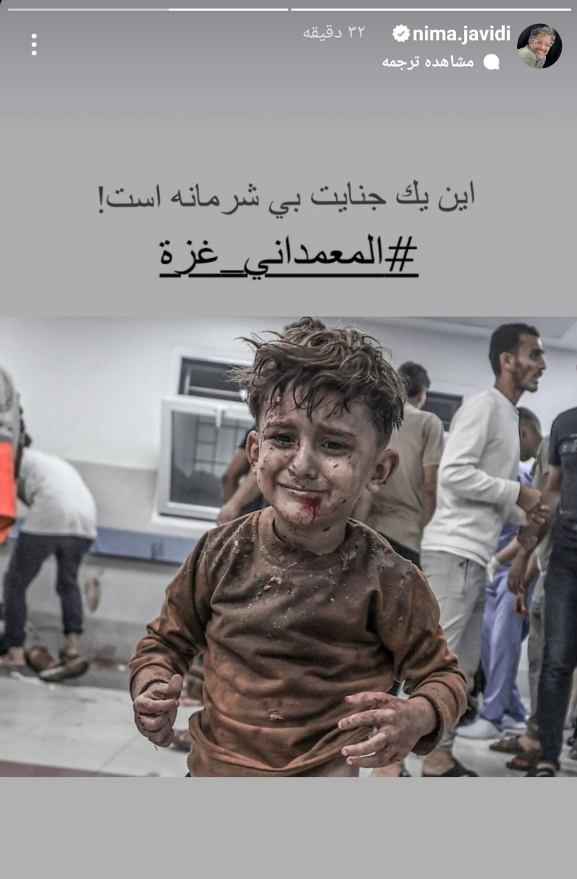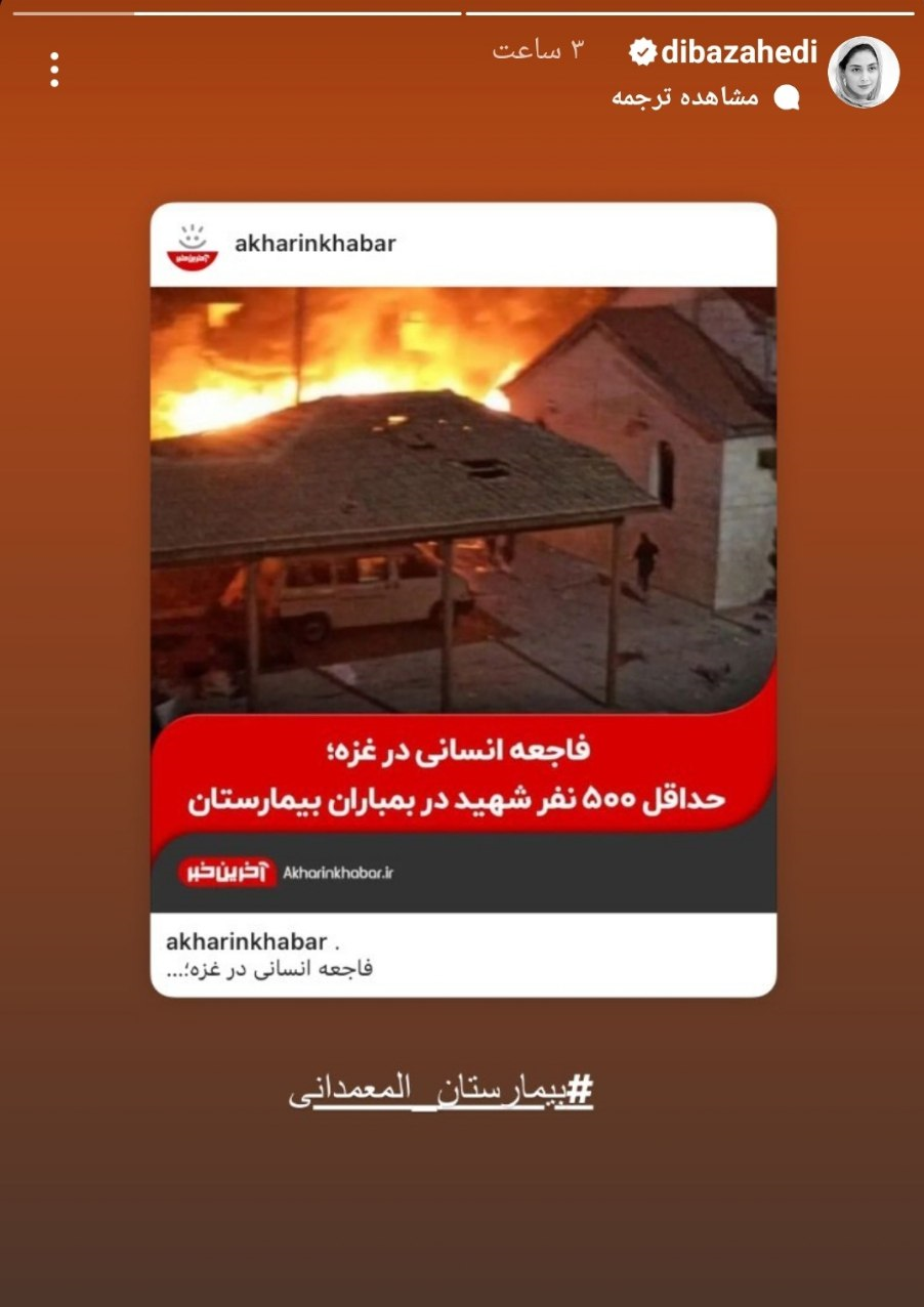 وبحسب مراسل نادي صحفيي تاوانا، فإن الإبادة الجماعية التي تعرض لها العزل ليلة الثلاثاء في قصف النظام الصهيوني لمستشفى “المحمداني” واستشهاد أكثر من 1000 فلسطيني، دفعت بعض المشاهير الإيرانيين إلى الاحتجاج على مقتل الشهيد. أكثر من 3000 شخص من سكان غزة خلال الـ 11 يومًا الماضية، التزموا الصمت للرد. وبطبيعة الحال، لا توجد حتى الآن أخبار عن إدانة مباشرة للكيان الصهيوني في النصوص أو صور المشاهير.