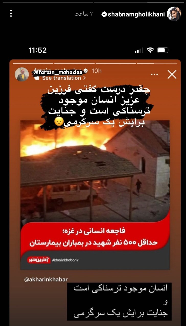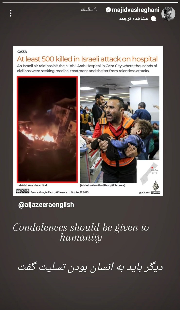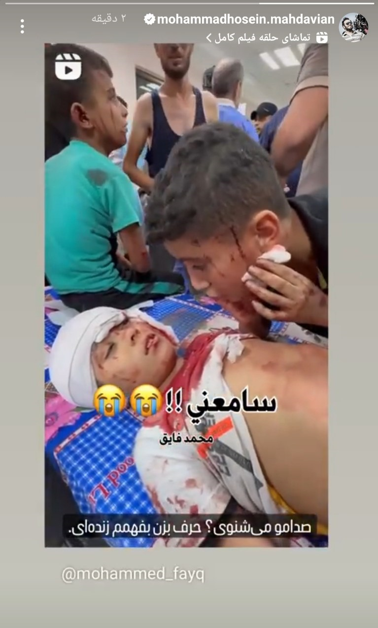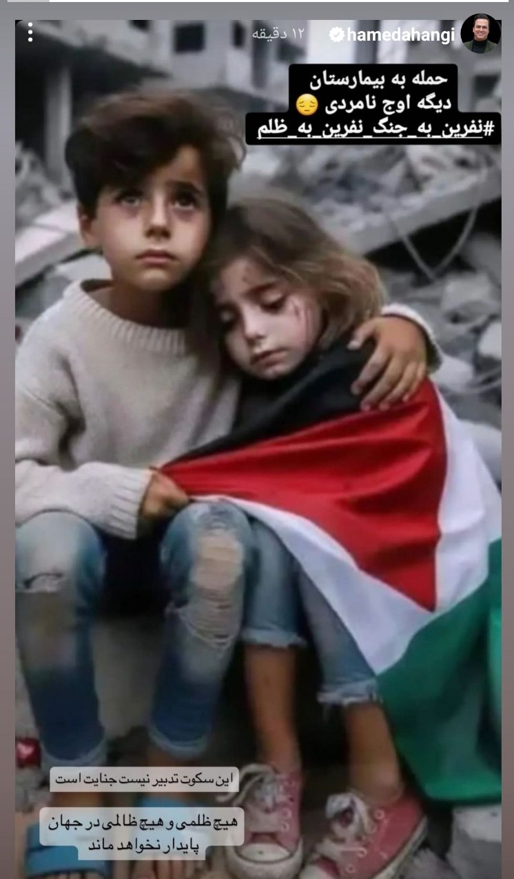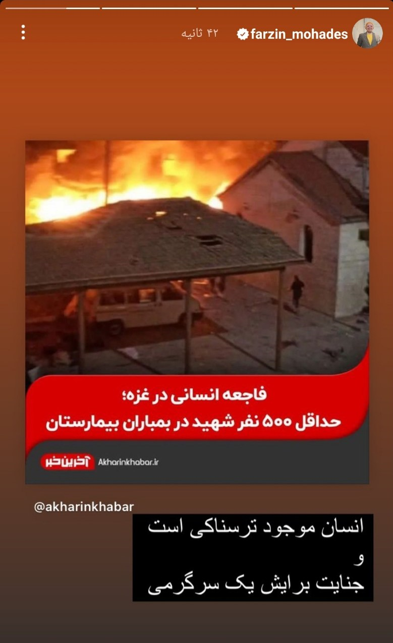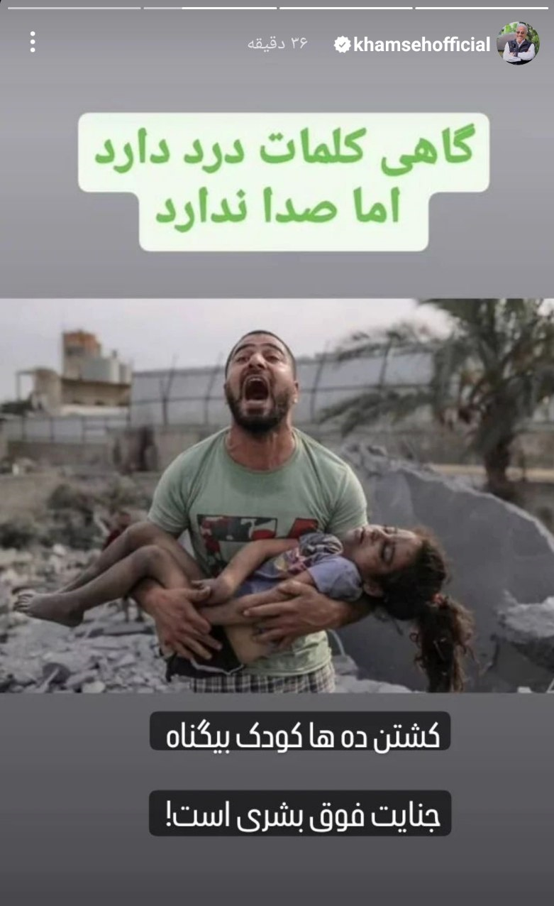 وبحسب مراسل نادي صحفيي تاوانا، فإن الإبادة الجماعية التي تعرض لها العزل ليلة الثلاثاء في قصف النظام الصهيوني لمستشفى “المحمداني” واستشهاد أكثر من 1000 فلسطيني، دفعت بعض المشاهير الإيرانيين إلى الاحتجاج على مقتل الشهيد. أكثر من 3000 شخص من سكان غزة خلال الـ 11 يومًا الماضية، التزموا الصمت للرد. وبطبيعة الحال، لا توجد حتى الآن أخبار عن إدانة مباشرة للكيان الصهيوني في النصوص أو صور المشاهير.