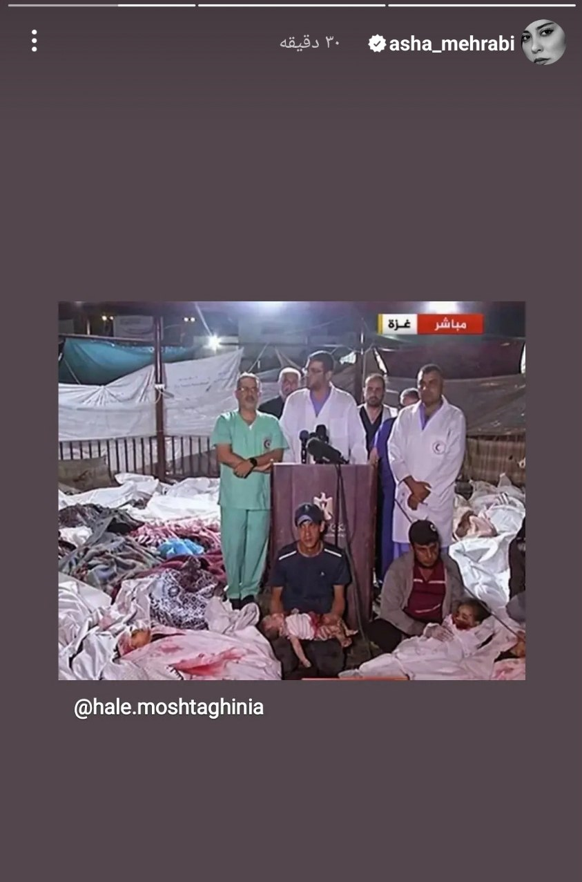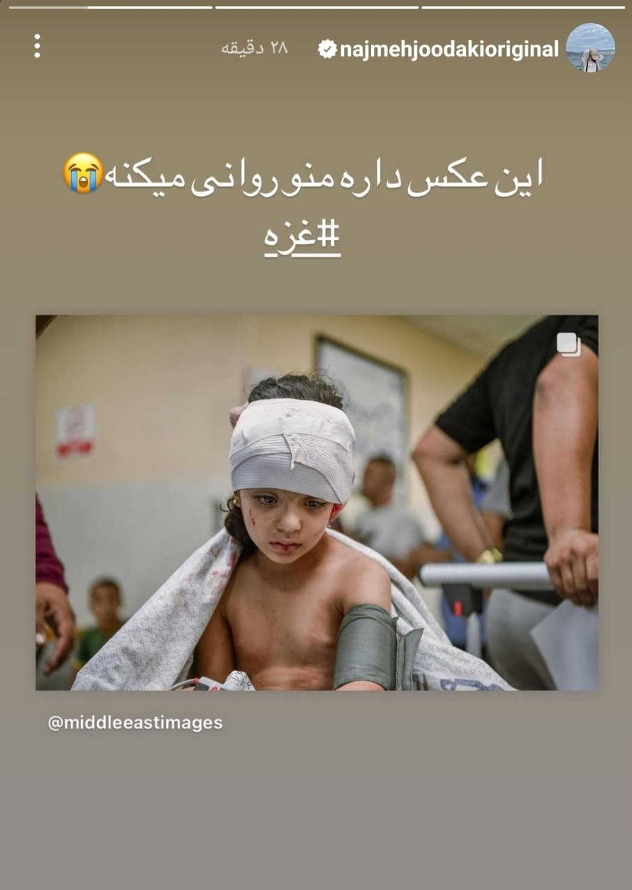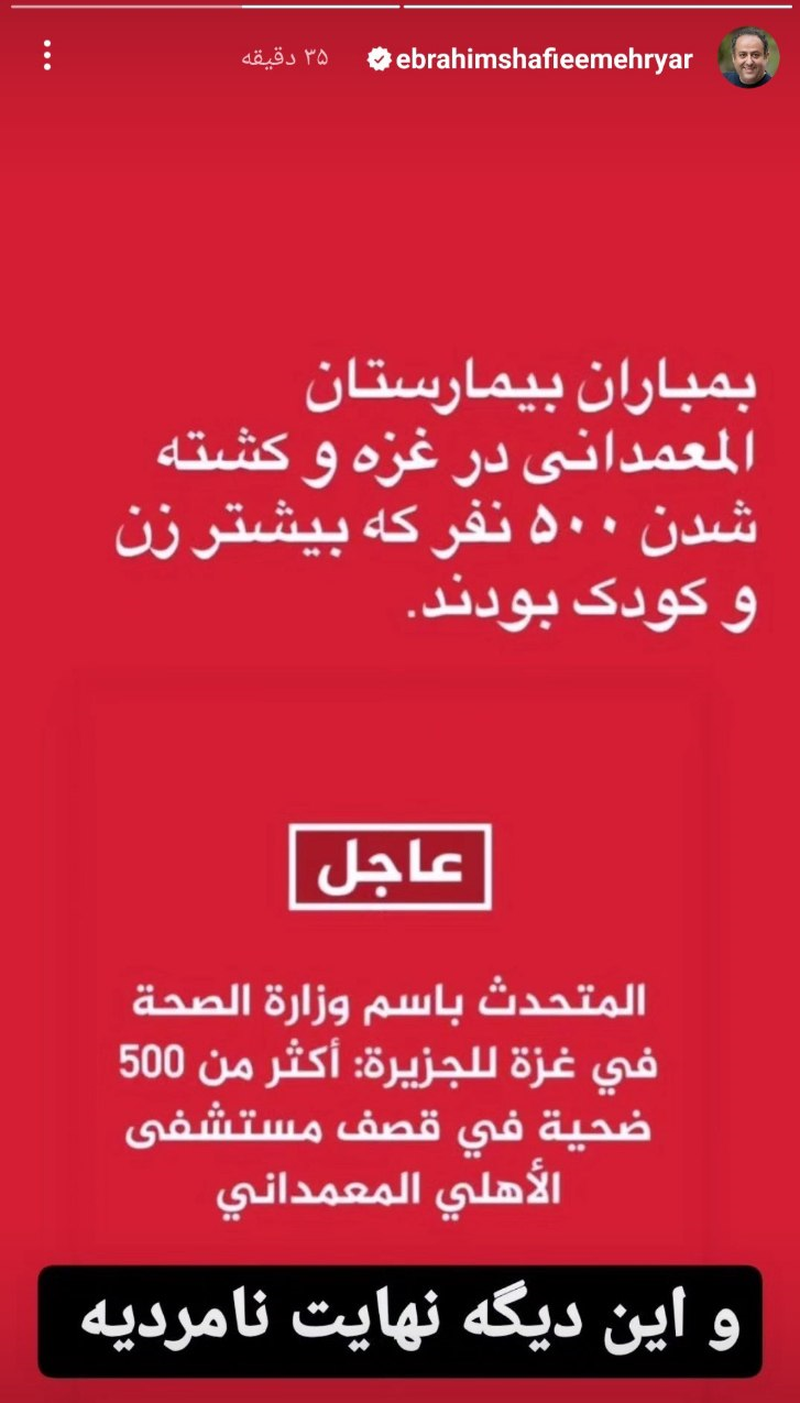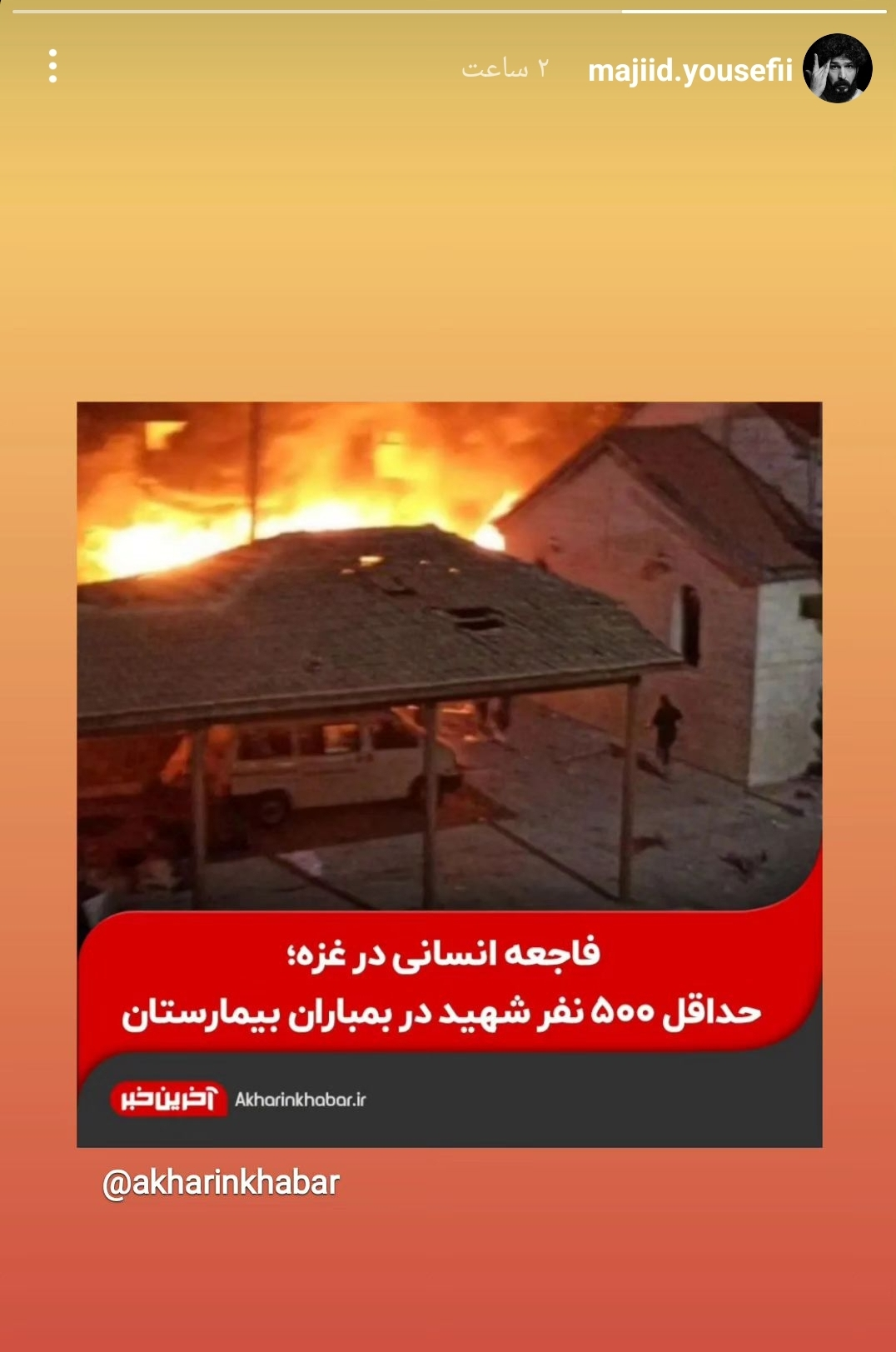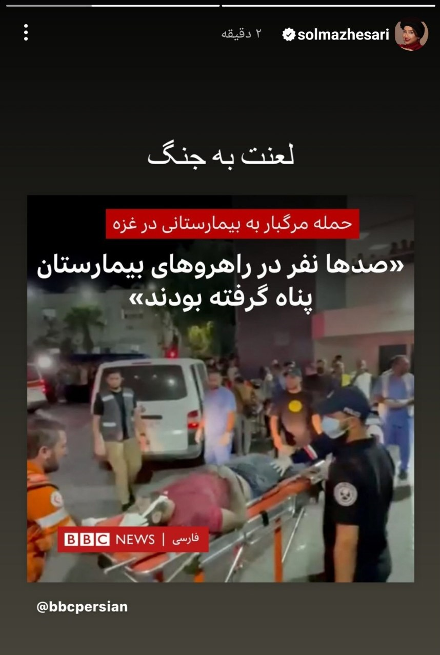 وبحسب مراسل نادي صحفيي تاوانا، فإن الإبادة الجماعية التي تعرض لها العزل ليلة الثلاثاء في قصف النظام الصهيوني لمستشفى “المحمداني” واستشهاد أكثر من 1000 فلسطيني، دفعت بعض المشاهير الإيرانيين إلى الاحتجاج على مقتل الشهيد. أكثر من 3000 شخص من سكان غزة خلال الـ 11 يومًا الماضية، التزموا الصمت للرد. وبطبيعة الحال، لا توجد حتى الآن أخبار عن إدانة مباشرة للكيان الصهيوني في النصوص أو صور المشاهير.