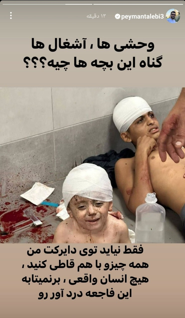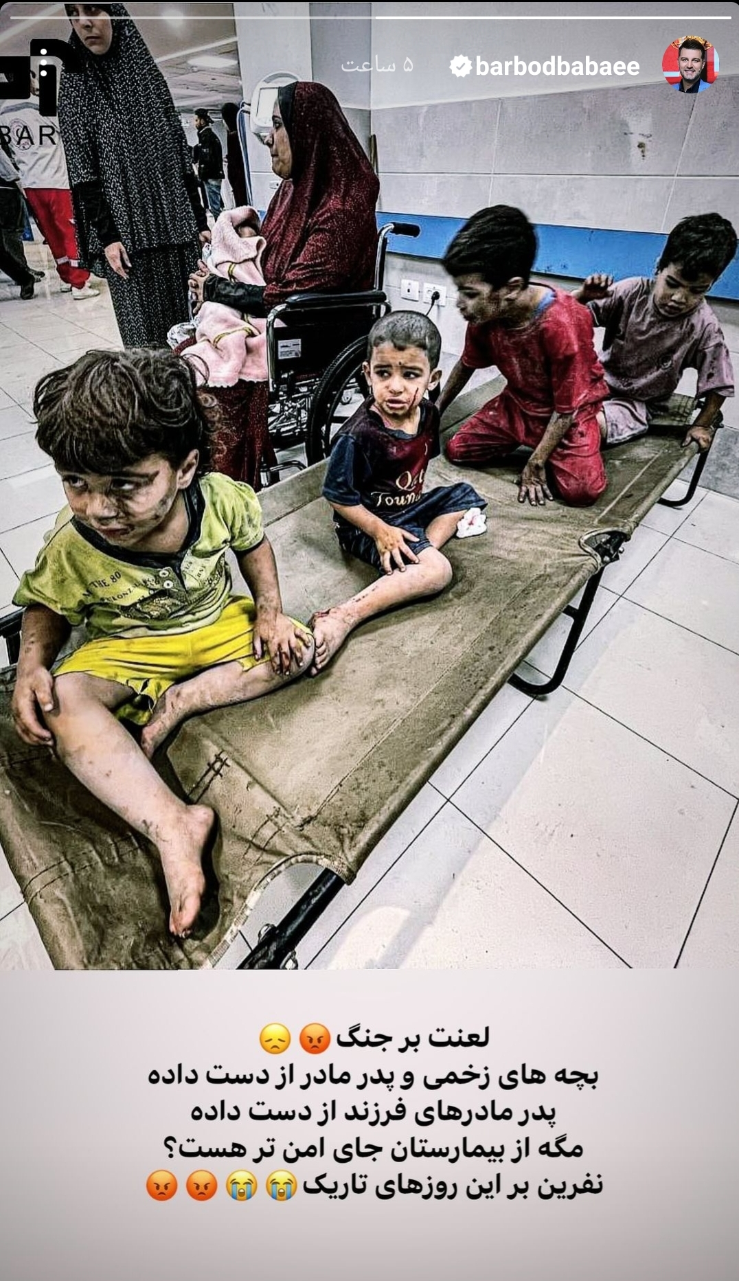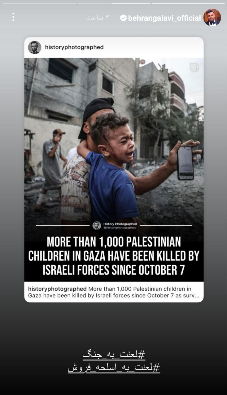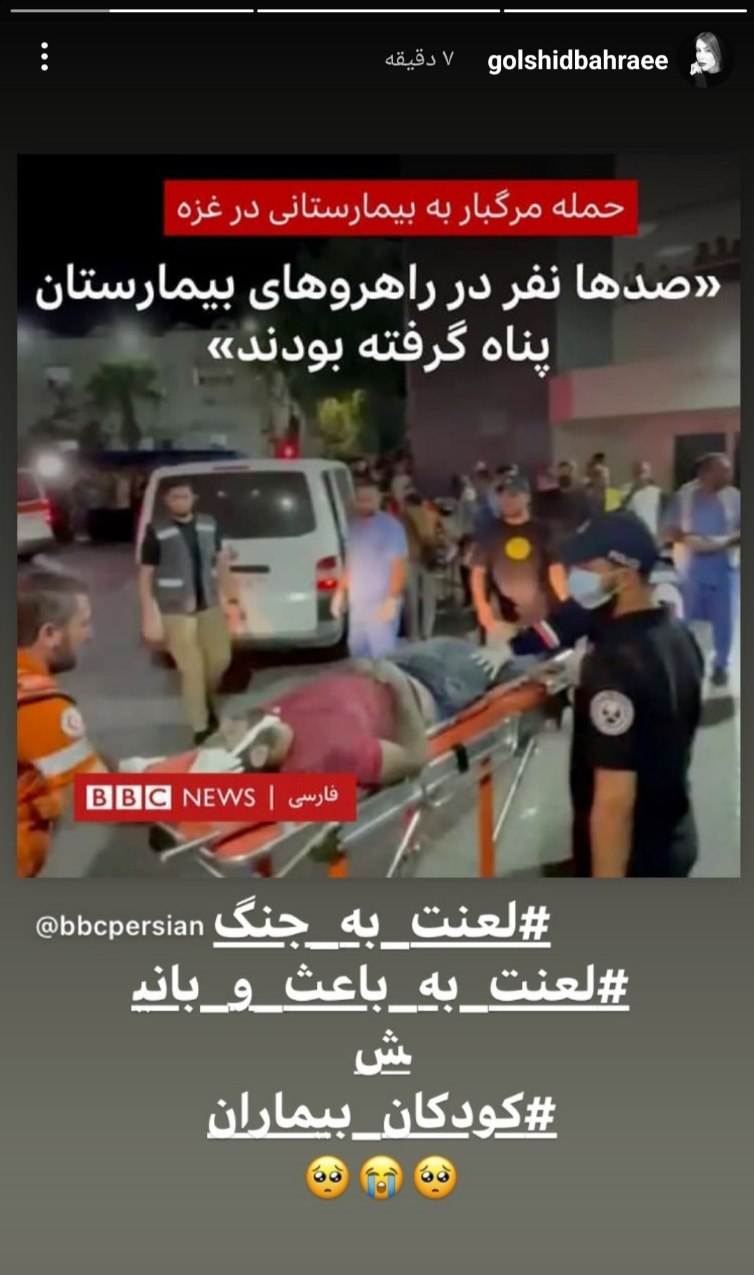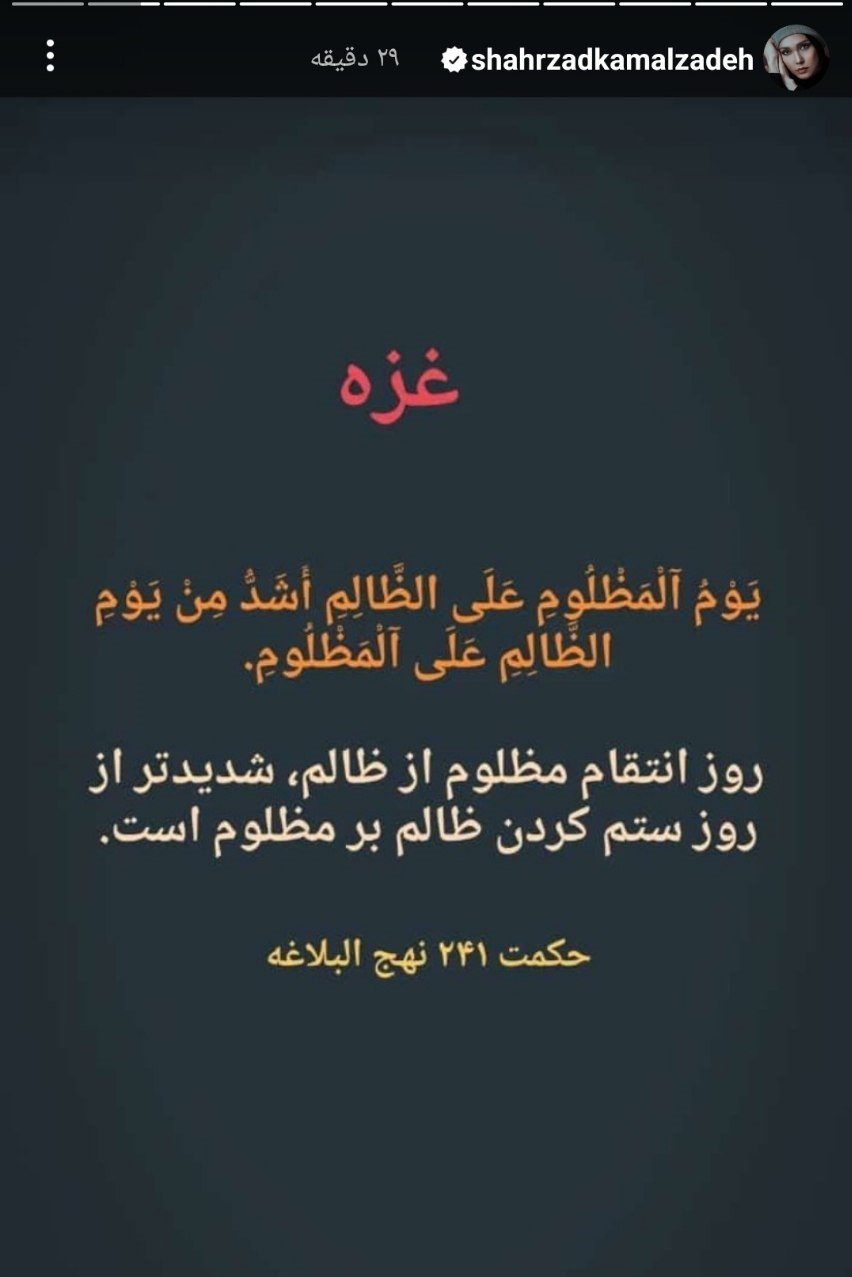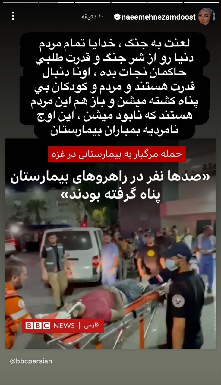 وبحسب مراسل نادي صحفيي تاوانا، فإن الإبادة الجماعية التي تعرض لها العزل ليلة الثلاثاء في قصف النظام الصهيوني لمستشفى “المحمداني” واستشهاد أكثر من 1000 فلسطيني، دفعت بعض المشاهير الإيرانيين إلى الاحتجاج على مقتل الشهيد. أكثر من 3000 شخص من سكان غزة خلال الـ 11 يومًا الماضية، التزموا الصمت للرد. وبطبيعة الحال، لا توجد حتى الآن أخبار عن إدانة مباشرة للكيان الصهيوني في النصوص أو صور المشاهير.