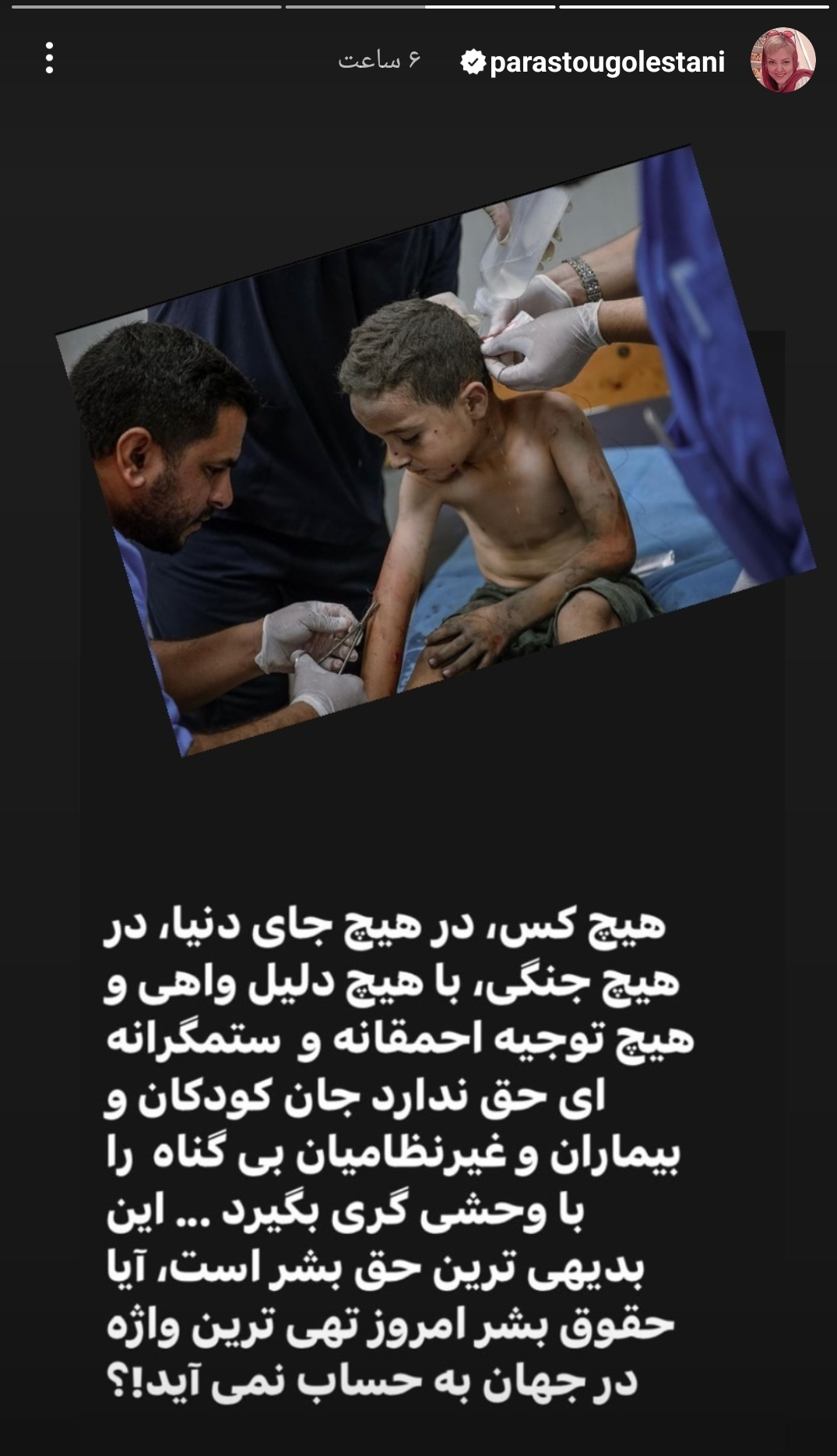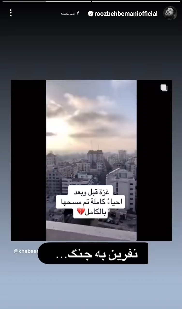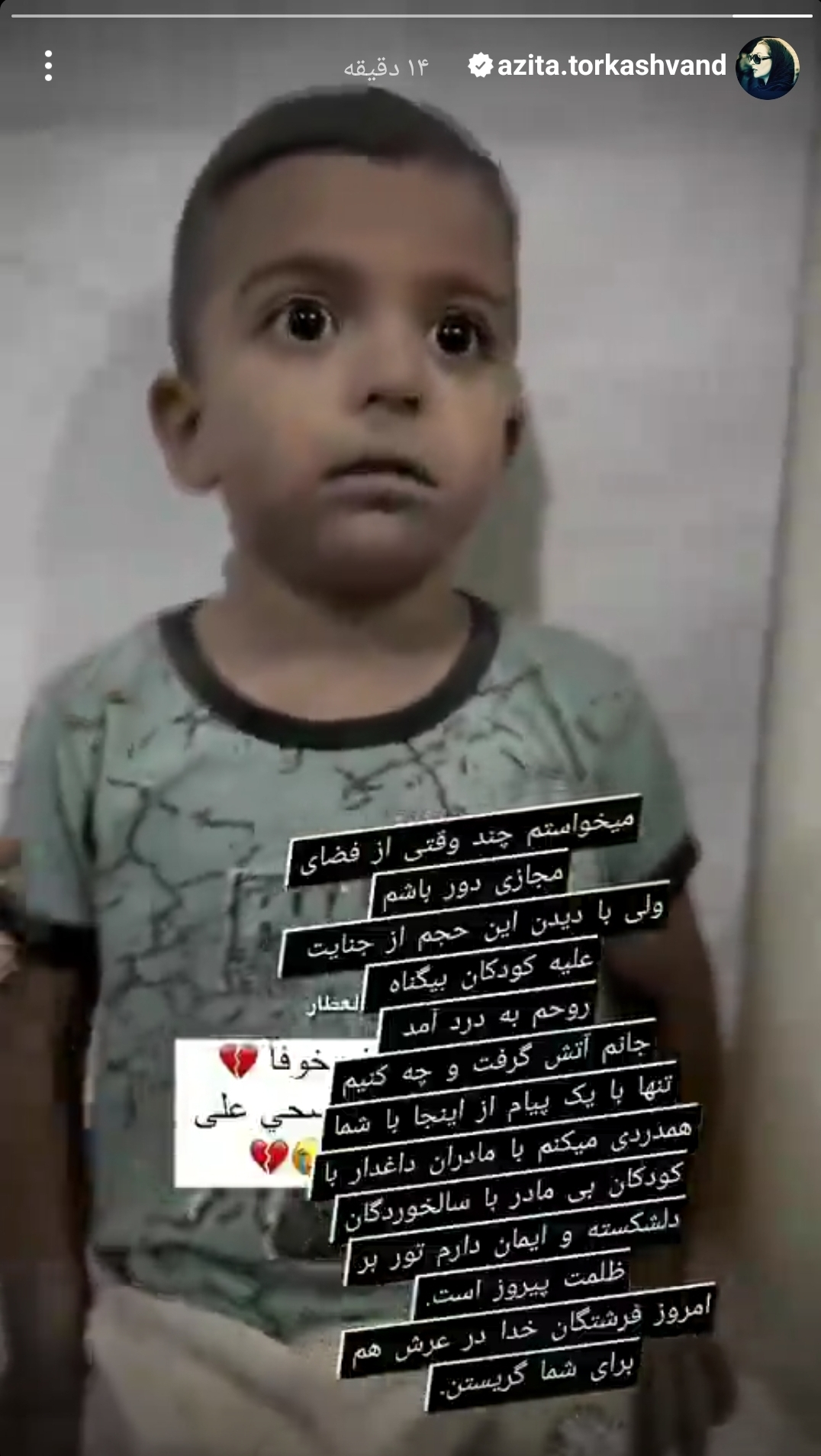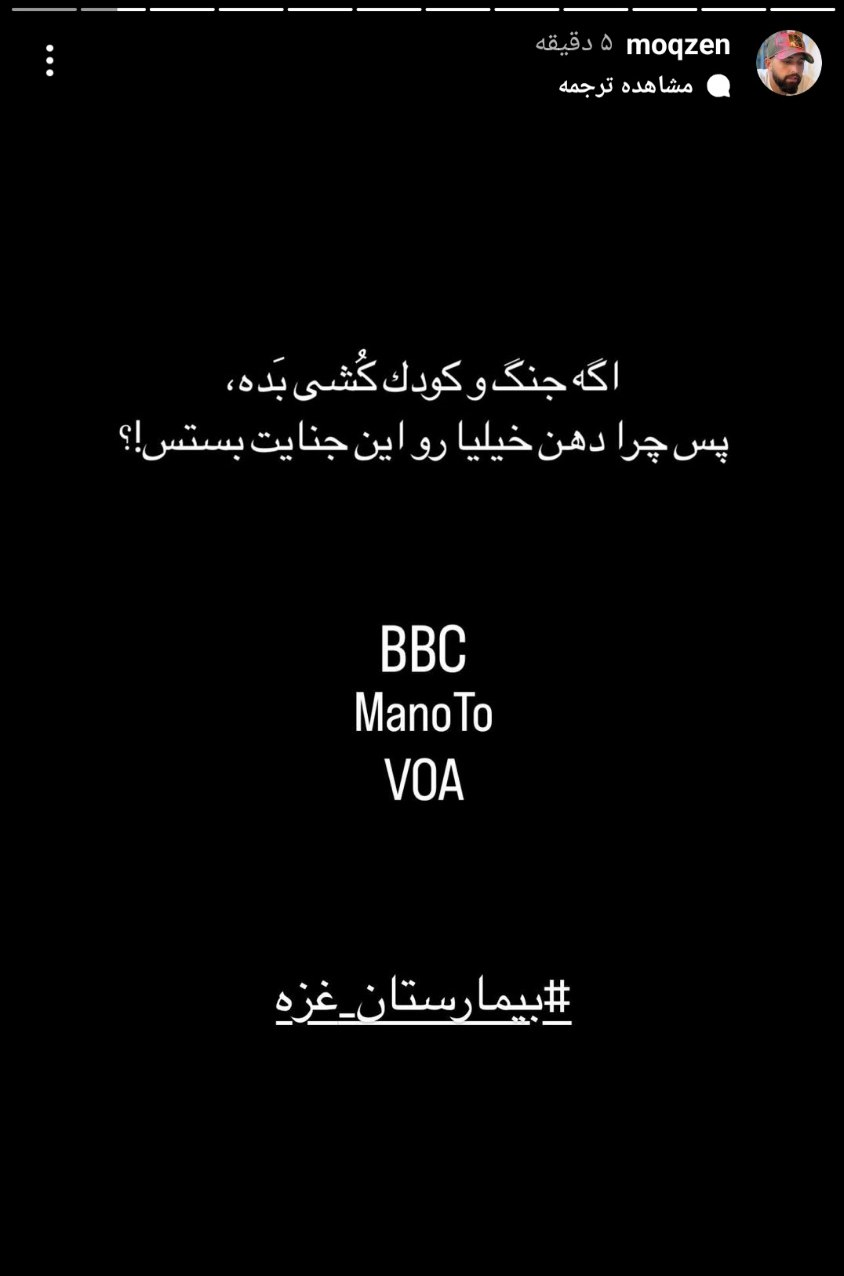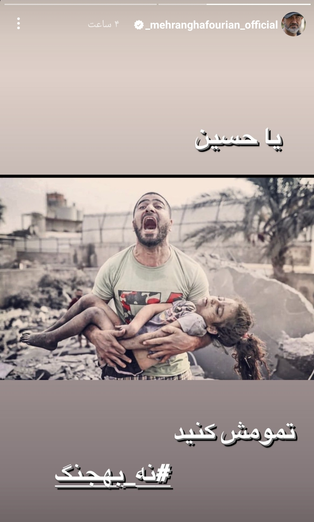 وبحسب مراسل نادي صحفيي تاوانا، فإن الإبادة الجماعية التي تعرض لها العزل ليلة الثلاثاء في قصف النظام الصهيوني لمستشفى “المحمداني” واستشهاد أكثر من 1000 فلسطيني، دفعت بعض المشاهير الإيرانيين إلى الاحتجاج على مقتل الشهيد. أكثر من 3000 شخص من سكان غزة خلال الـ 11 يومًا الماضية، التزموا الصمت للرد. وبطبيعة الحال، لا توجد حتى الآن أخبار عن إدانة مباشرة للكيان الصهيوني في النصوص أو صور المشاهير.