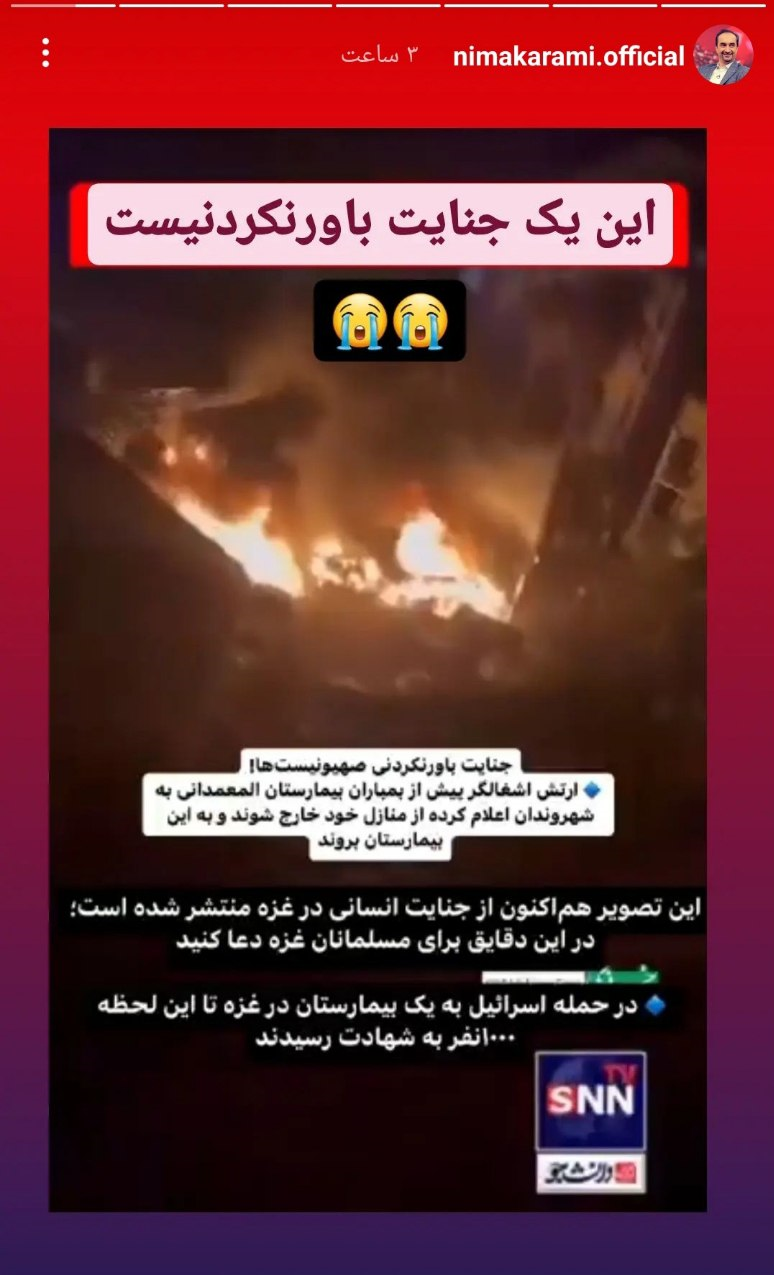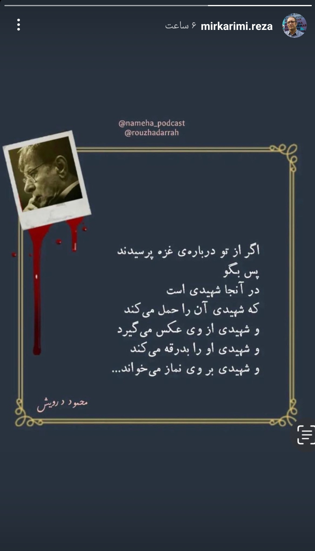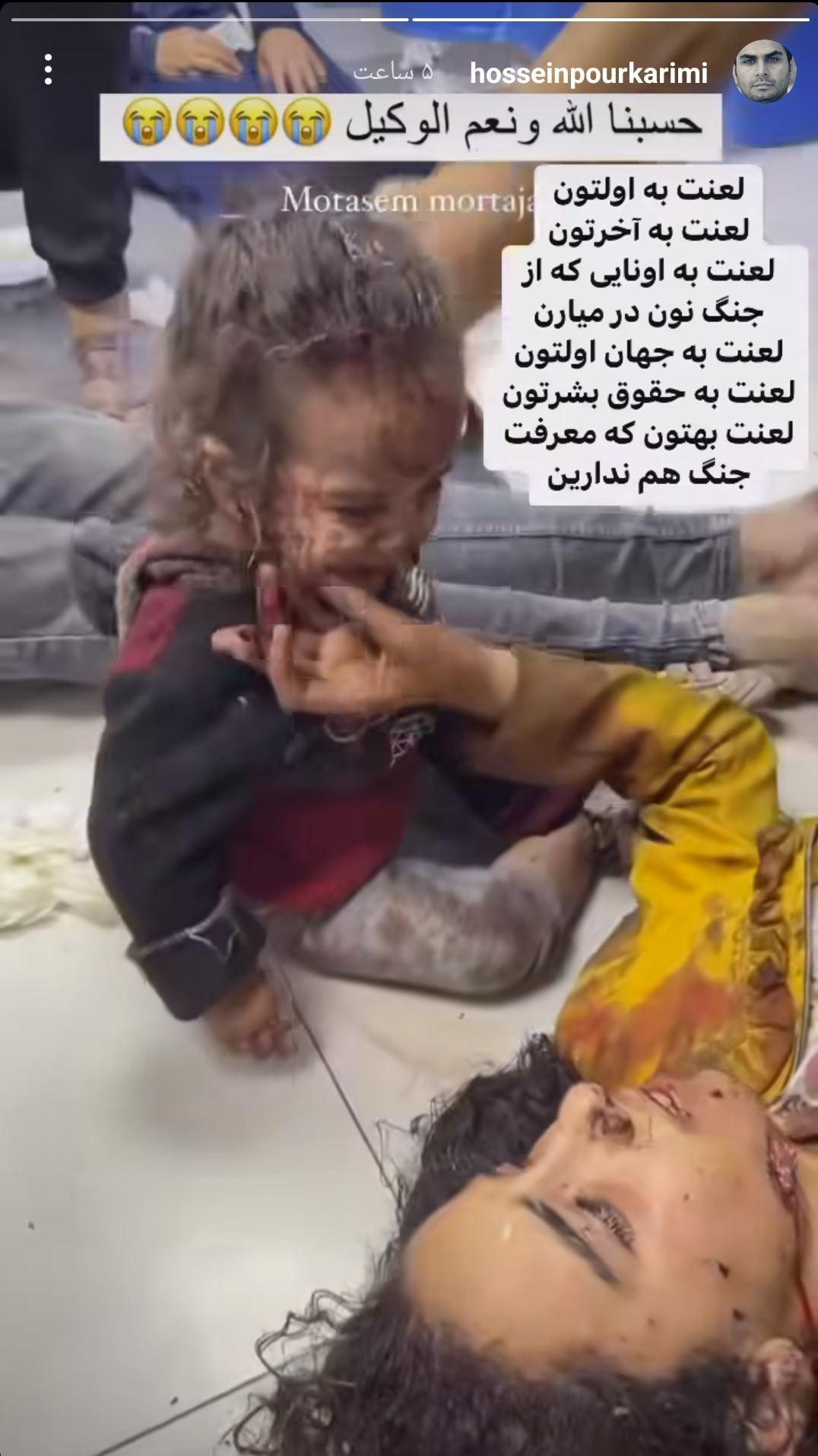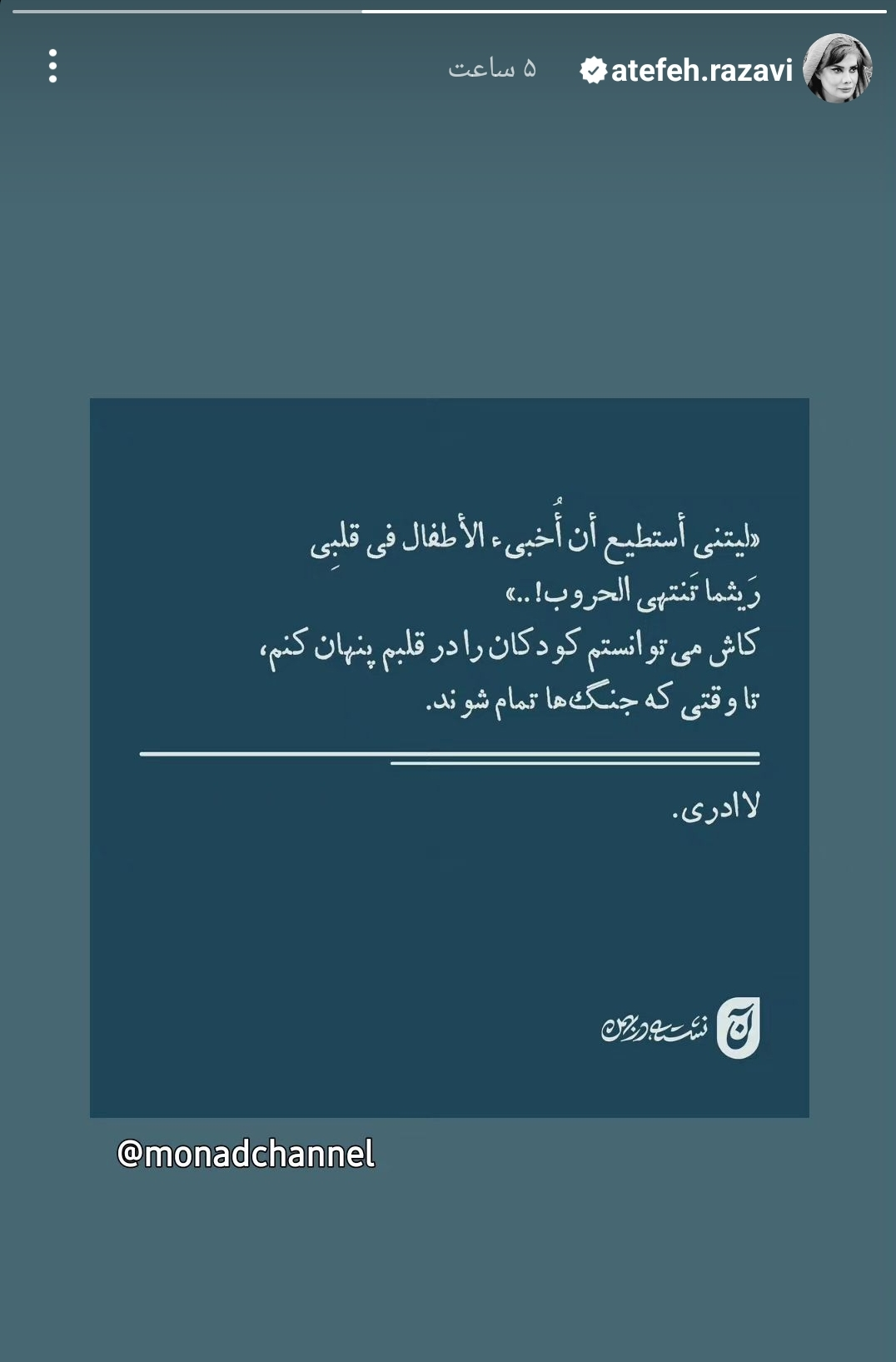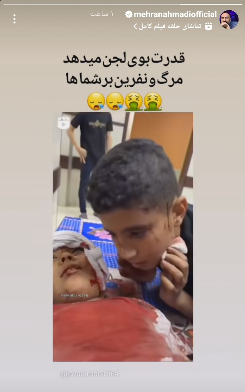 وبحسب مراسل نادي صحفيي تاوانا، فإن الإبادة الجماعية التي تعرض لها العزل ليلة الثلاثاء في قصف النظام الصهيوني لمستشفى “المحمداني” واستشهاد أكثر من 1000 فلسطيني، دفعت بعض المشاهير الإيرانيين إلى الاحتجاج على مقتل الشهيد. أكثر من 3000 شخص من سكان غزة خلال الـ 11 يومًا الماضية، التزموا الصمت للرد. وبطبيعة الحال، لا توجد حتى الآن أخبار عن إدانة مباشرة للكيان الصهيوني في النصوص أو صور المشاهير.