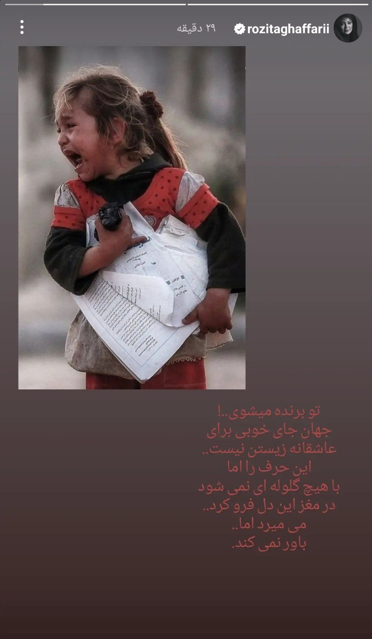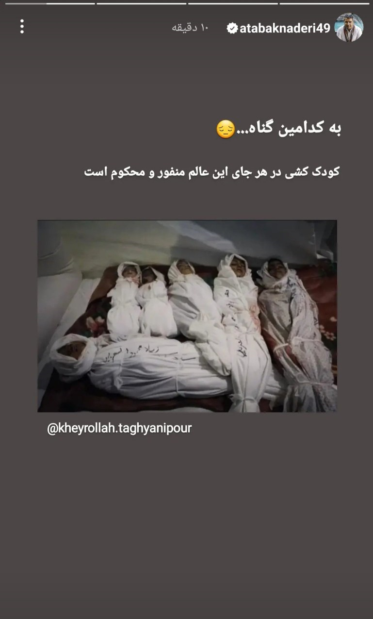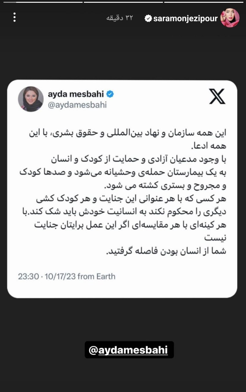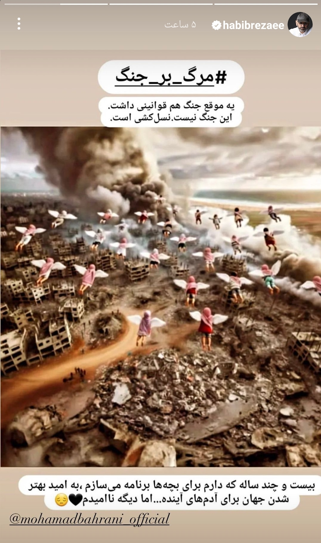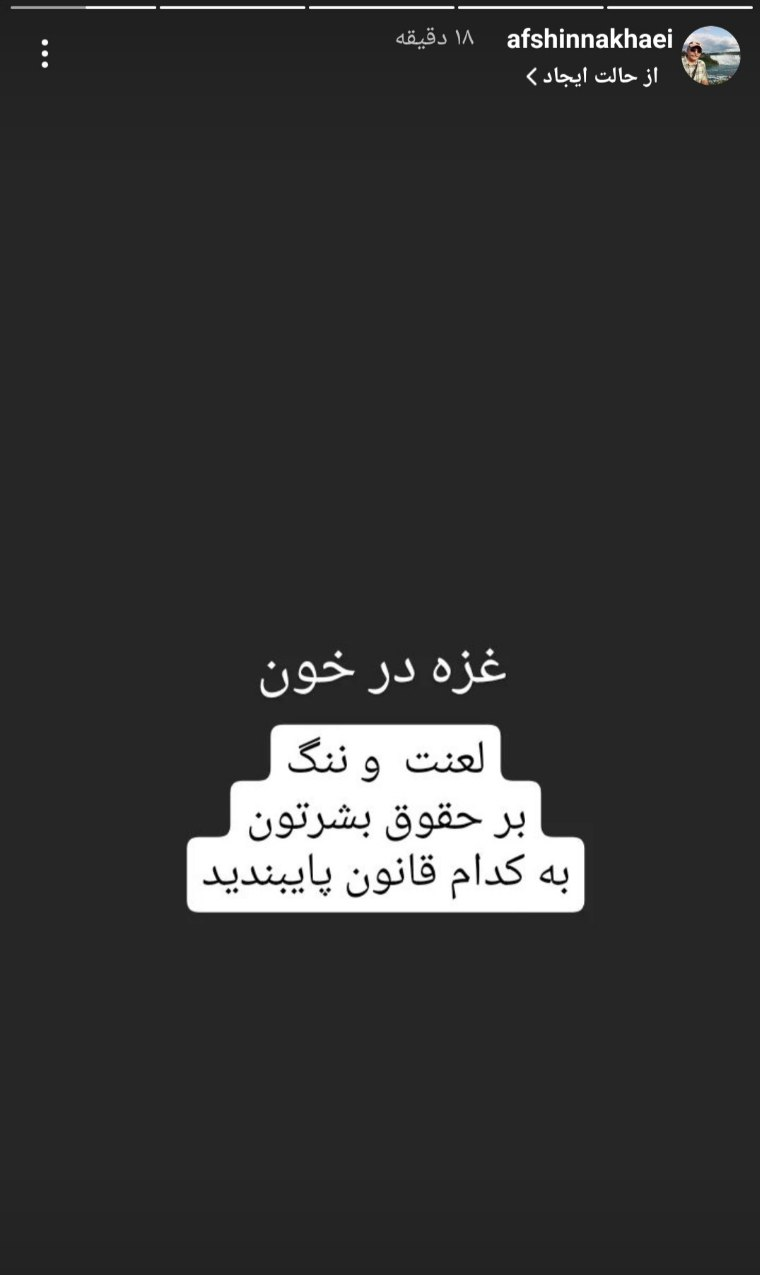 وبحسب مراسل نادي صحفيي تاوانا، فإن الإبادة الجماعية التي تعرض لها العزل ليلة الثلاثاء في قصف النظام الصهيوني لمستشفى “المحمداني” واستشهاد أكثر من 1000 فلسطيني، دفعت بعض المشاهير الإيرانيين إلى الاحتجاج على مقتل الشهيد. أكثر من 3000 شخص من سكان غزة خلال الـ 11 يومًا الماضية، التزموا الصمت للرد. وبطبيعة الحال، لا توجد حتى الآن أخبار عن إدانة مباشرة للكيان الصهيوني في النصوص أو صور المشاهير.