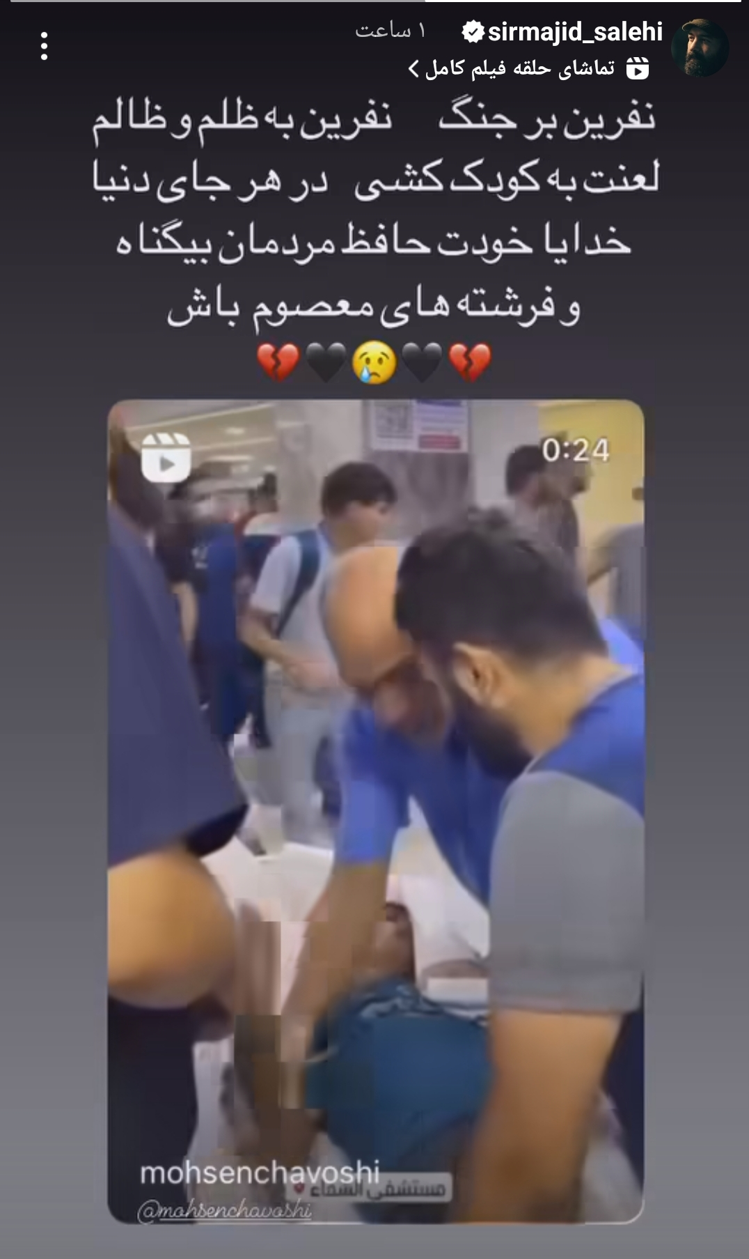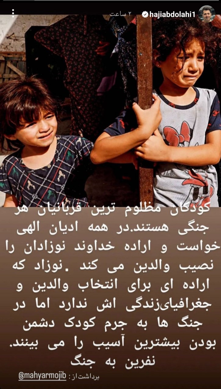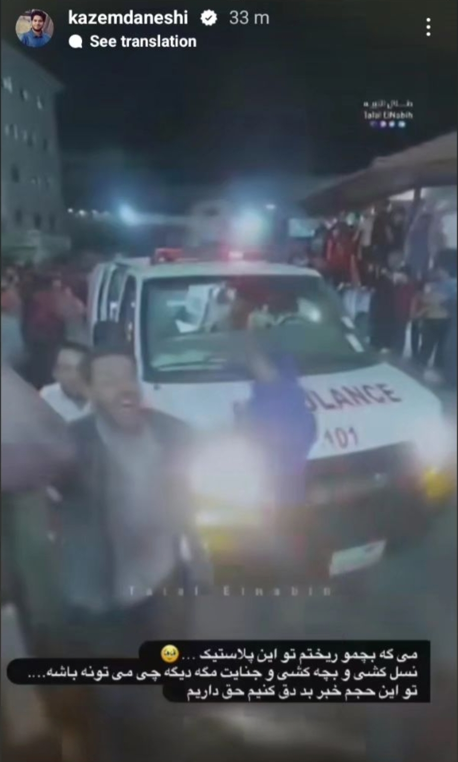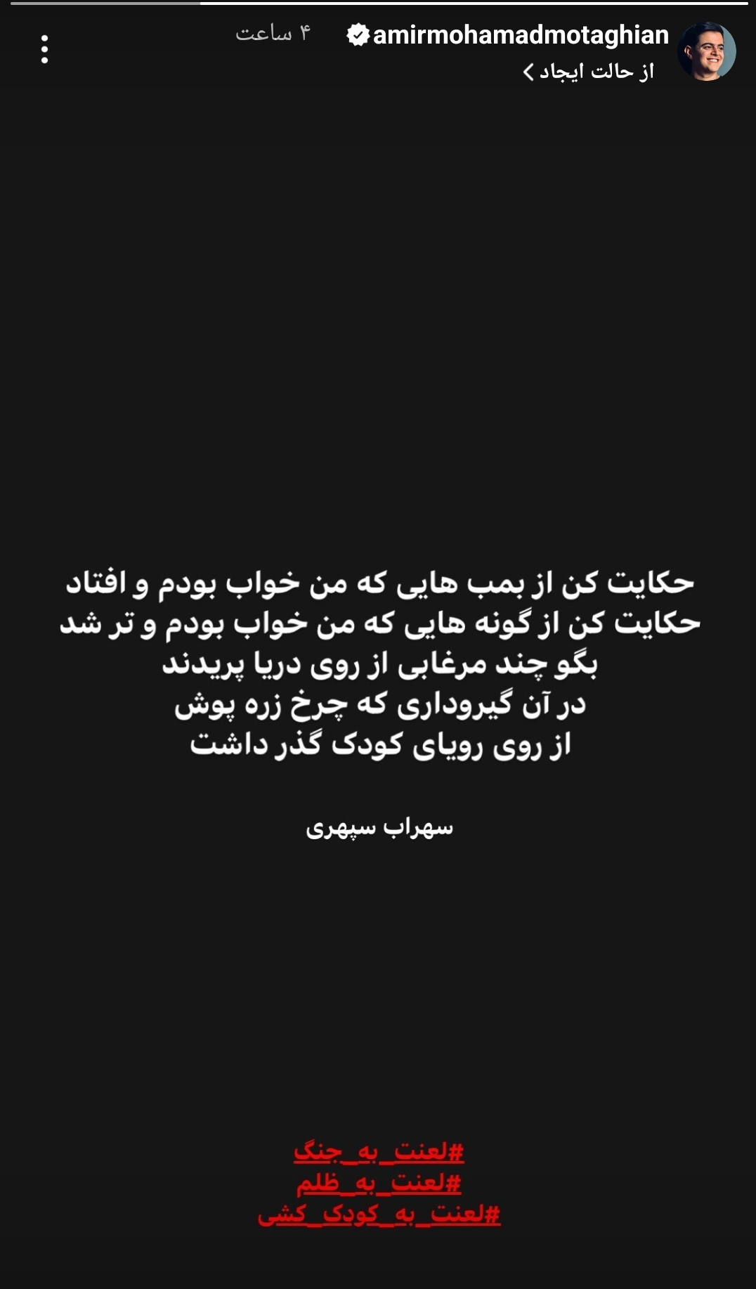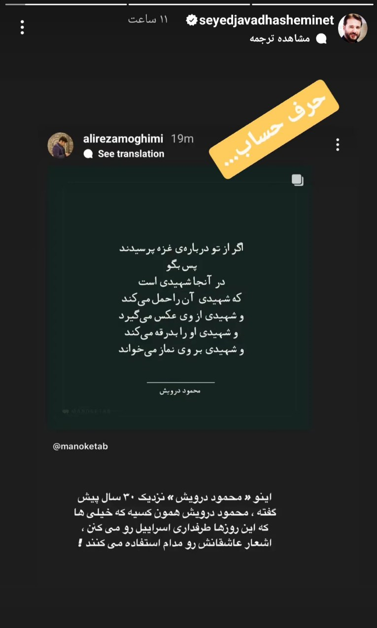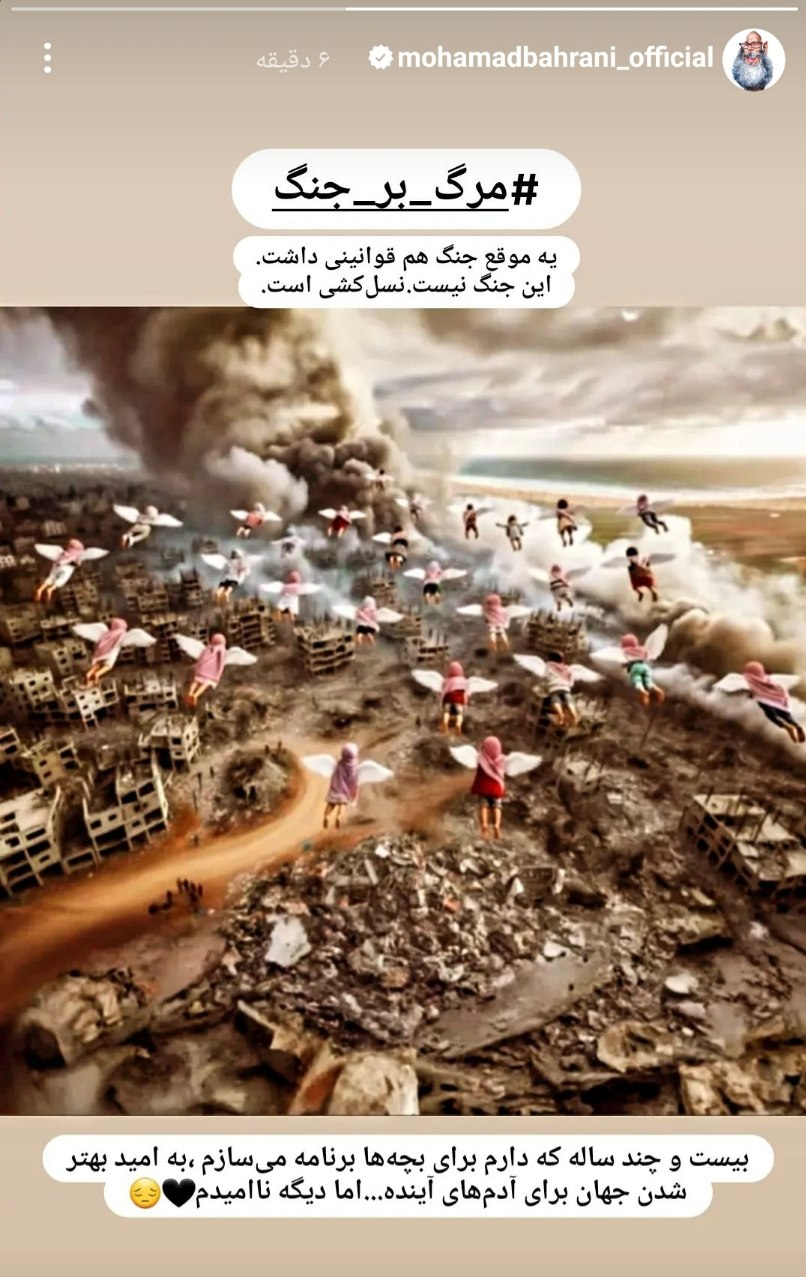 وبحسب مراسل نادي صحفيي تاوانا، فإن الإبادة الجماعية التي تعرض لها العزل ليلة الثلاثاء في قصف النظام الصهيوني لمستشفى “المحمداني” واستشهاد أكثر من 1000 فلسطيني، دفعت بعض المشاهير الإيرانيين إلى الاحتجاج على مقتل الشهيد. أكثر من 3000 شخص من سكان غزة خلال الـ 11 يومًا الماضية، التزموا الصمت للرد. وبطبيعة الحال، لا توجد حتى الآن أخبار عن إدانة مباشرة للكيان الصهيوني في النصوص أو صور المشاهير.