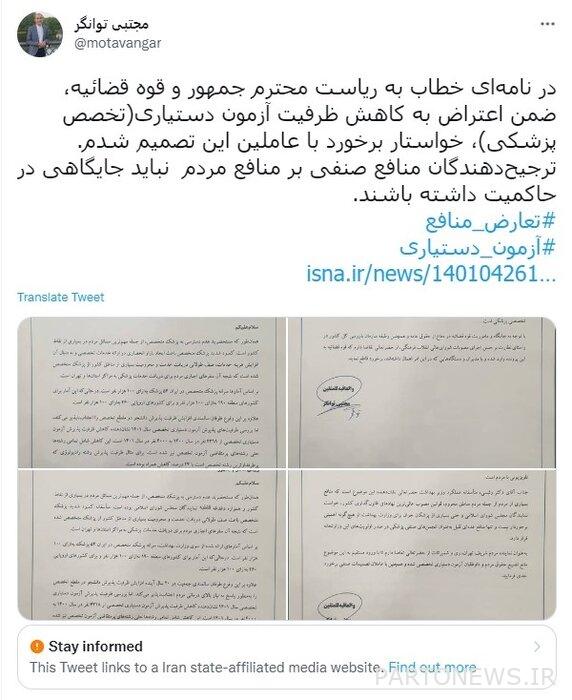 وكتب في تغريدة أخرى: في رسالة وجهها إلى رئيس الجمهورية والسلطة القضائية ، أثناء احتجاجي على تقليص قدرة امتحان الاستعانة (تخصص طبي) ، طالبت بالتعامل مع مرتكبي هذا القرار. أولئك الذين يفضلون المصالح النقابية على مصالح الناس يجب ألا يكون لهم مكان في الحكومة.