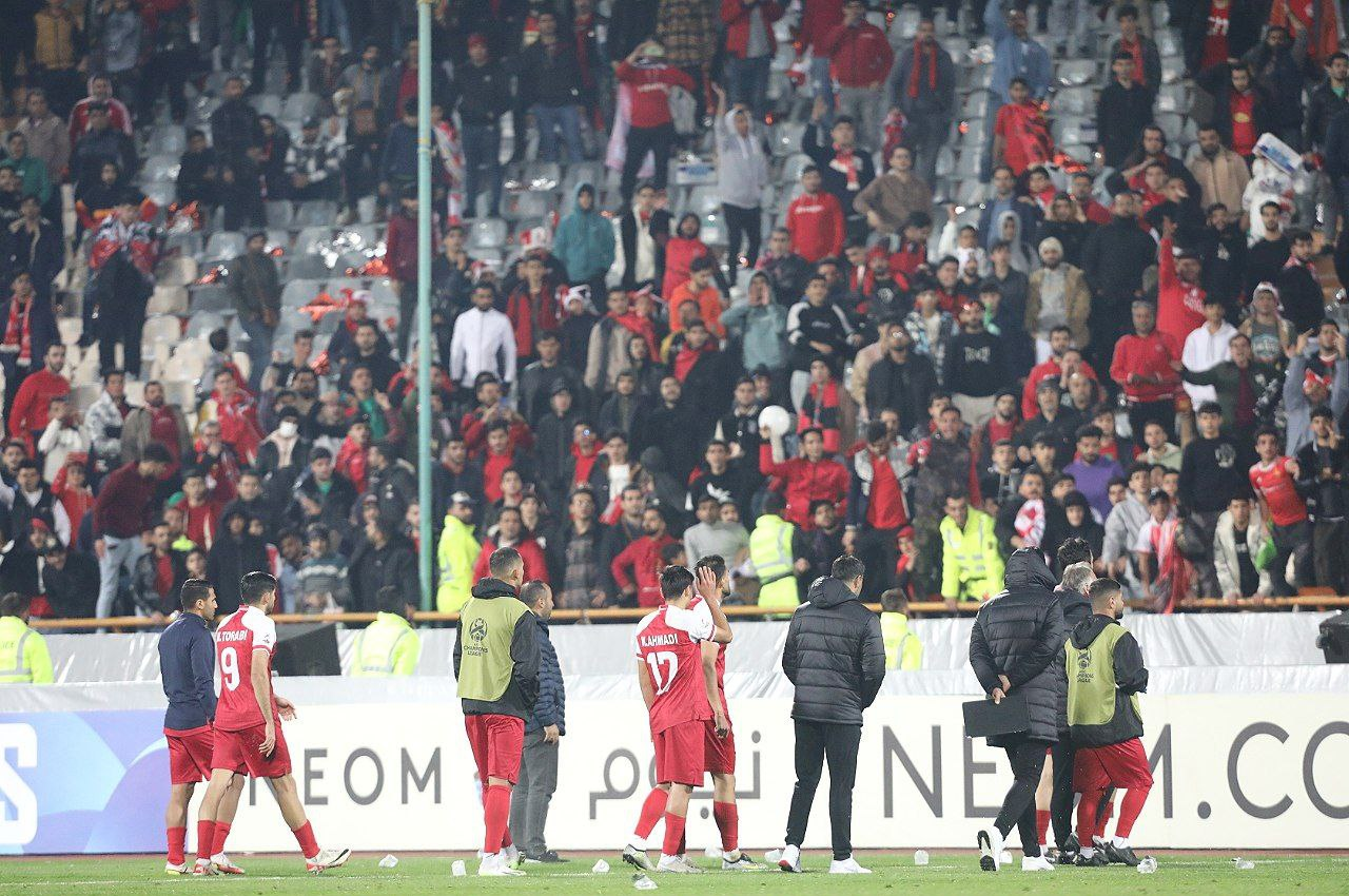 *هتفت جماهير بيرسيبوليس ضد لاعبي هذا الفريق منذ منتصف الوقت الإضافي من الشوط الثاني وألقت الزجاجات في أرض الملعب، ولهذا السبب أوقف الحكم المباراة لثواني معدودة.