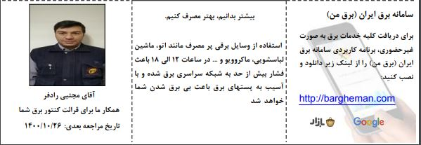 في هذا القسم ، يمكن لمشترك الكهرباء المنزلية الإبلاغ عن استهلاكه الشهري ، ومقارنة كمية الكهرباء المستخدمة مع المشتركين المجاورين ، وكذلك مشتركي المدن الآخرين ، وتقدير مستوى استهلاكه بدقة فيما يتعلق بنمط الاستهلاك.