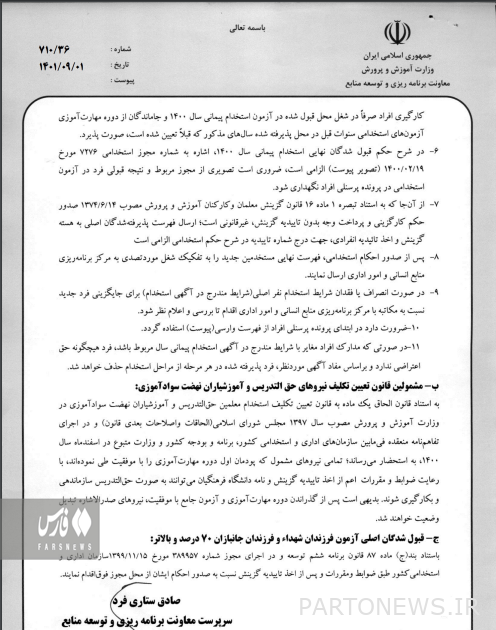 بناء على قانون إضافة مادة إلى القانون بشأن تحديد واجبات المعلمين لحق التدريس ومعلمي حركة محو الأمية بوزارة التربية والتعليم ، الذي أقره المجلس الإسلامي عام 2017 (إضافات وتعديلات لاحقة على قانون محو الأمية). القانون) وتنفيذاً لمذكرة التفاهم المبرمة بين المنظمات الإدارية والتوظيفية في الدولة ، يذكر البرنامج وميزانية الدولة والوزارة ذات الصلة في مارس 1400 جميع القوات المؤهلة التي اجتازت بنجاح الوحدة الأولى من الدورة التدريبية على المهارات ، من خلال مراعاة القواعد واللوائح ، بما في ذلك الحصول على موافقة الاختيار ورسالة من جامعة Farhangian ، يمكن تنظيمها وتوظيفها في شكل رسوم دراسية.