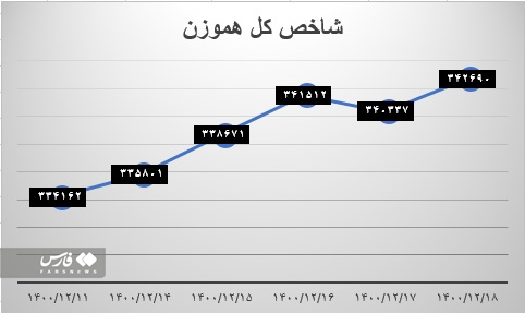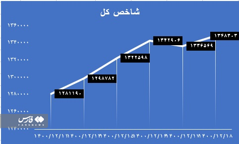 وصعد المؤشر يوم الاثنين لليوم الثالث على التوالي تاركا زيادة قدرها 20308 وحدات. ويوم الثلاثاء ، انخفض المؤشر مقابل التوقعات وانخفض بمقدار 6337 وحدة. لكن في آخر يوم عمل من الأسبوع ، ارتفع المؤشر الإجمالي لبورصة طهران بمقدار 11734 وحدة.