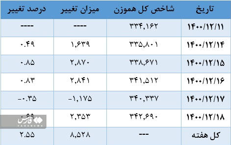 ارتفع المؤشر 2841 نقطة يوم الاثنين وانخفض بمقدار 1175 نقطة يوم الثلاثاء مثل جميع مؤشرات الأسهم الأخرى. وبلغ نمو هذا المؤشر يوم الأربعاء 2،353 وحدة. كان المؤشر العام المتجانس في نهاية الأسبوع أعلى بنسبة 8.528 نقطة عن الأسبوع السابق وسجل عائدًا إيجابيًا بنسبة 2.55٪.