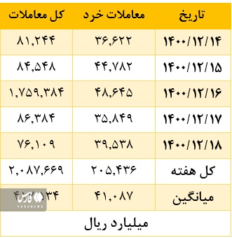 واجه سوق الأسهم الأسبوع الماضي زيادة في حجم التداولات الصغيرة وإجمالي التداولات. يعتقد بعض خبراء سوق رأس المال في هذا الصدد ، أنه إذا استقرت قيمة معاملات التجزئة فوق 4 آلاف مليار تومان ، يمكننا أن نأمل أن تكون البورصة قد خرجت إلى حد كبير من الركود الذي حدث في الأشهر الأخيرة.