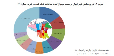 The distribution of the number of transactions carried out according to different regions of Tehran in July 1401 indicates that among the 22 regions of Tehran, region 5 has the largest number of declaratory contracts with a share of 14.6% of all transactions. Is.
