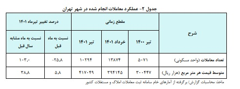 In this report prepared by Central Bank’s Department of Economic Research and Policy, it is stated: In July 1401, the number of residential apartments traded in Tehran reached about 3.10 thousand residential units, which is more than the previous month and the same month of the year. The former shows a decrease of 8.25% and an increase of 0.103%, respectively.