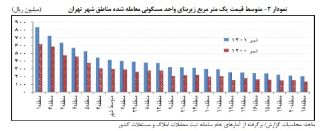 Among the 22 regions of Tehran municipality, the highest average price of one square meter of residential infrastructure traded equal to 837.5 million rials belonged to region 1 and the lowest with 207.8 million rials to region 18.
