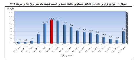 Also, 7.56 percent of residential units were traded at a price lower than the average price per square meter of a residential unit in this month (417 million Rials), and 50.9 percent of the transactions required residential units with a value of less than 3 billion Tomans per unit. Is.