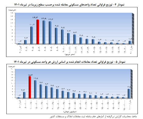 The frequency distribution of the number of residential units traded in Tehran city in July 1401 shows that in terms of area, residential units with a surface area of less than 80 square meters have a share equal to 54.2% of the transactions.