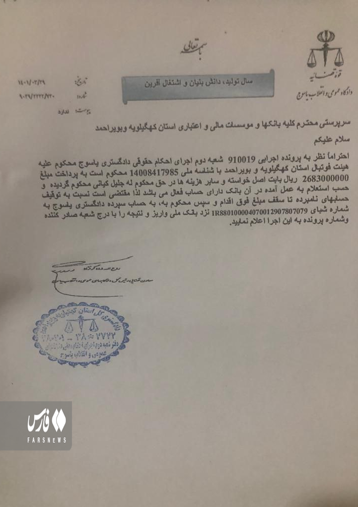 This assistant referee from Kohgiluyeh and Boyer Ahmad emphasized: One of the creditors was a person named Jalil Kiani who had the most demands from the football team, his principal amount with his late fine was about 60 million tomans. He went to the delegation several times to receive this request, but Afsharian dismissed this person, and Kayani, according to the ruling he received from the provincial appeals court, seized the Peugeot car and blocked the delegation’s accounts.