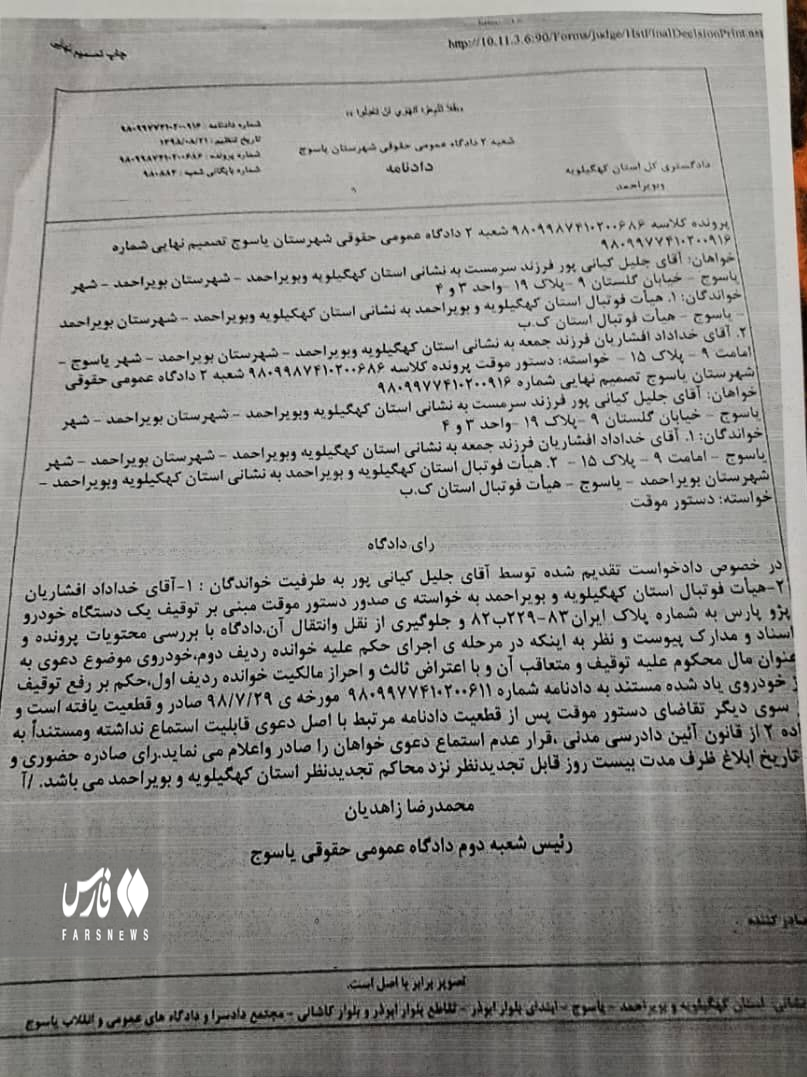 In an interview with the sports reporter of Fars news agency, Siavash Bagheranjad said about some uncertainties regarding the activities of Khodadad Afsharian in the football team of Kohgilouye and Boyer Ahmad, he said: The documents I am presenting are related to the football team of Kohgilouye and Boyer Ahmed. The first document is related to the time of General Secretary Mohammad Reza Saket in the Football Federation in 1997. On August 27 of that year, 2 people were qualified for the football board of this province, but Khodadad Afsharian, who has been working as the head of the football board since the same year and after some time became a member of the board of the federation and head of the referees committee. At first, due to not having the necessary management records and also not being qualified, he could not participate in the board elections, but with the mediation and consultations that were carried out by Gachsaran’s then representative in the Islamic Council, Gholamreza Tajgerdoun, with Soltanifar, the Minister of Sports and Youth, Mehdi Taj They persuaded Afsharian’s name to be added to the candidates for the football board elections. Finally, on March 7, 1997, he was officially elected as the head of the delegation in the assembly of this province.