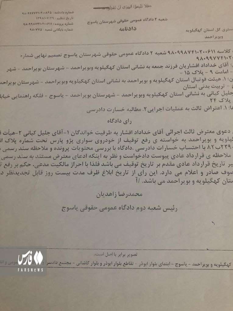 Bagherenjad continued: Kayani did not hesitate and after issuing the decision to release Khodro, he took action through the judicial deputy of the judiciary to inquire and not deny Afsharian. This deputy also inquired from the Director General of Sports and Youth of Kohgiluyeh and asked him to announce if the football team has a car. Mohammad Taqi Alavi, the general manager at the time, also wrote a letter and attached it to Afsharian to be accountable in this case, but referring to the general manager’s letter, he stated that the football team does not have any cars and denies that this Peugeot belongs to the team and says According to the decision, this car is in his possession.