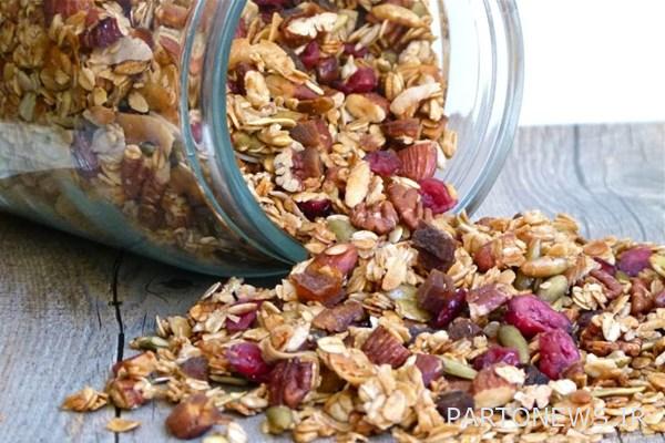 To prepare granola, nuts such as almonds, walnuts, pumpkin seeds, raisins, coconut, cinnamon, honey and several other additives are usually used to the liking of people. If you are allergic to any of these substances or your diet prevents you from following it, you can mix and consume only oatmeal with milk or yogurt. Among the nuts, berries are a good dietary option to add to and granulate the granola.